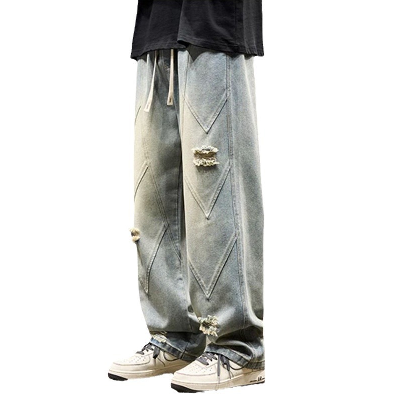 破洞牛仔裤男美式高街复古水洗做旧长裤春夏新款痞帅直筒裤子