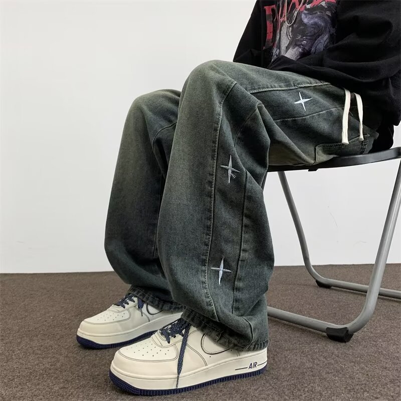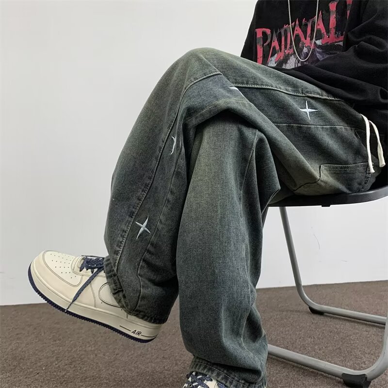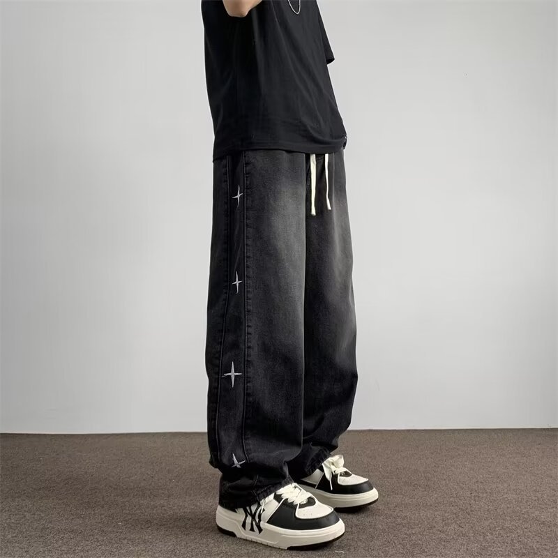 新款星星刺绣牛仔裤男士潮牌美式高街复古做旧高街阔腿长裤子