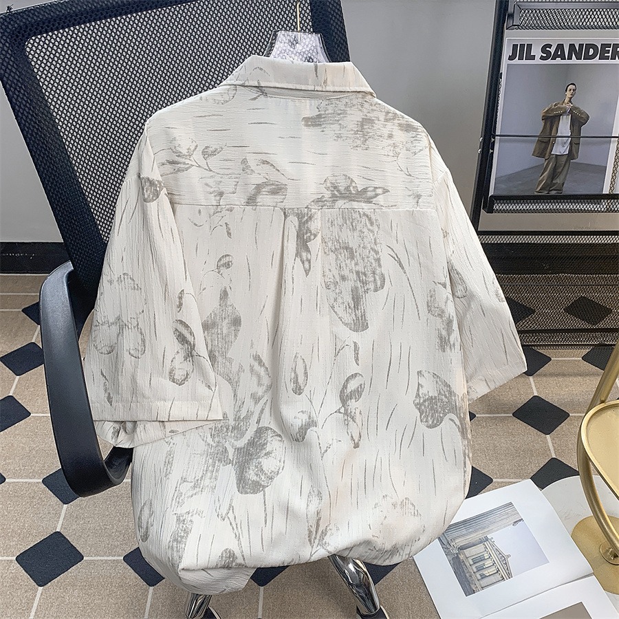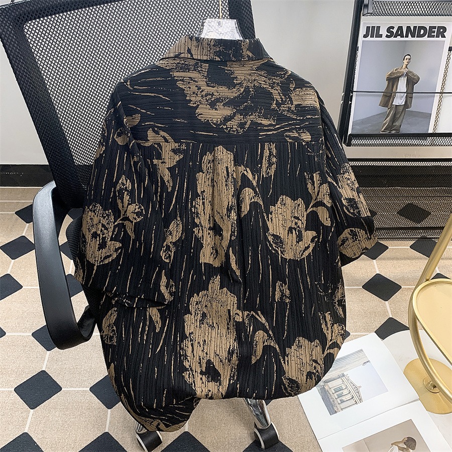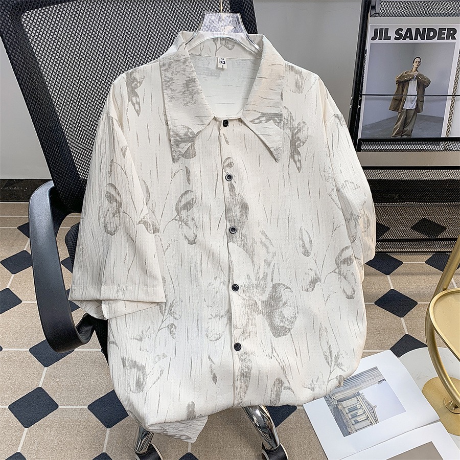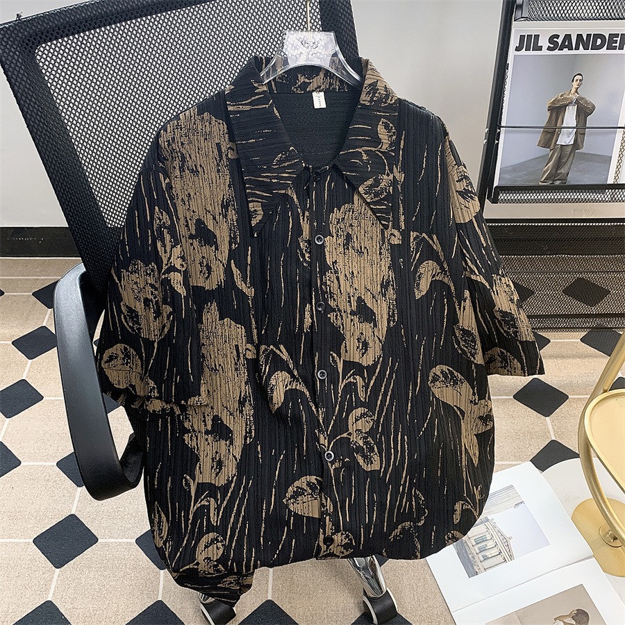 暗纹印花短袖衬衫男夏季潮流日系复古肌理褶皱尖领五分半袖衬衣潮