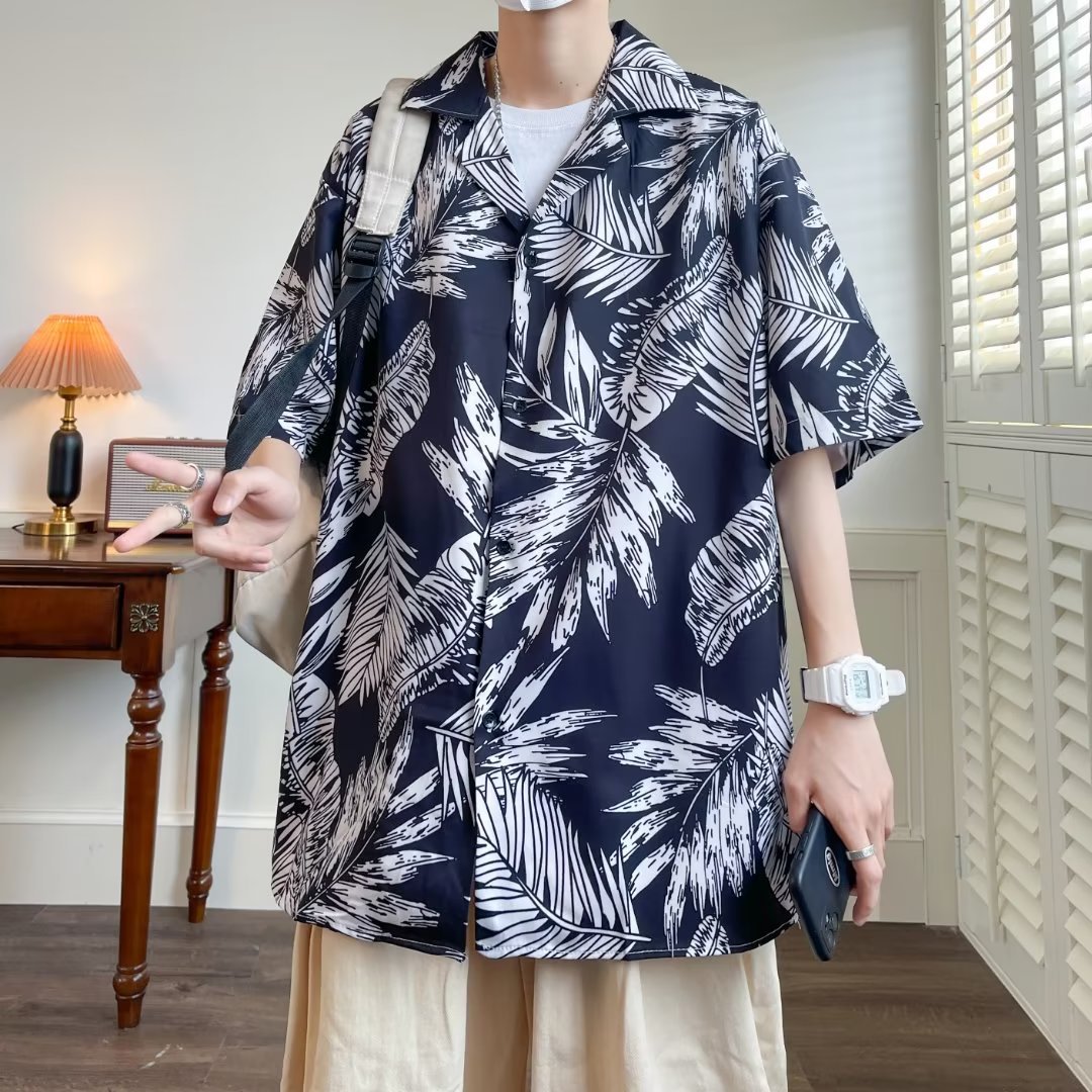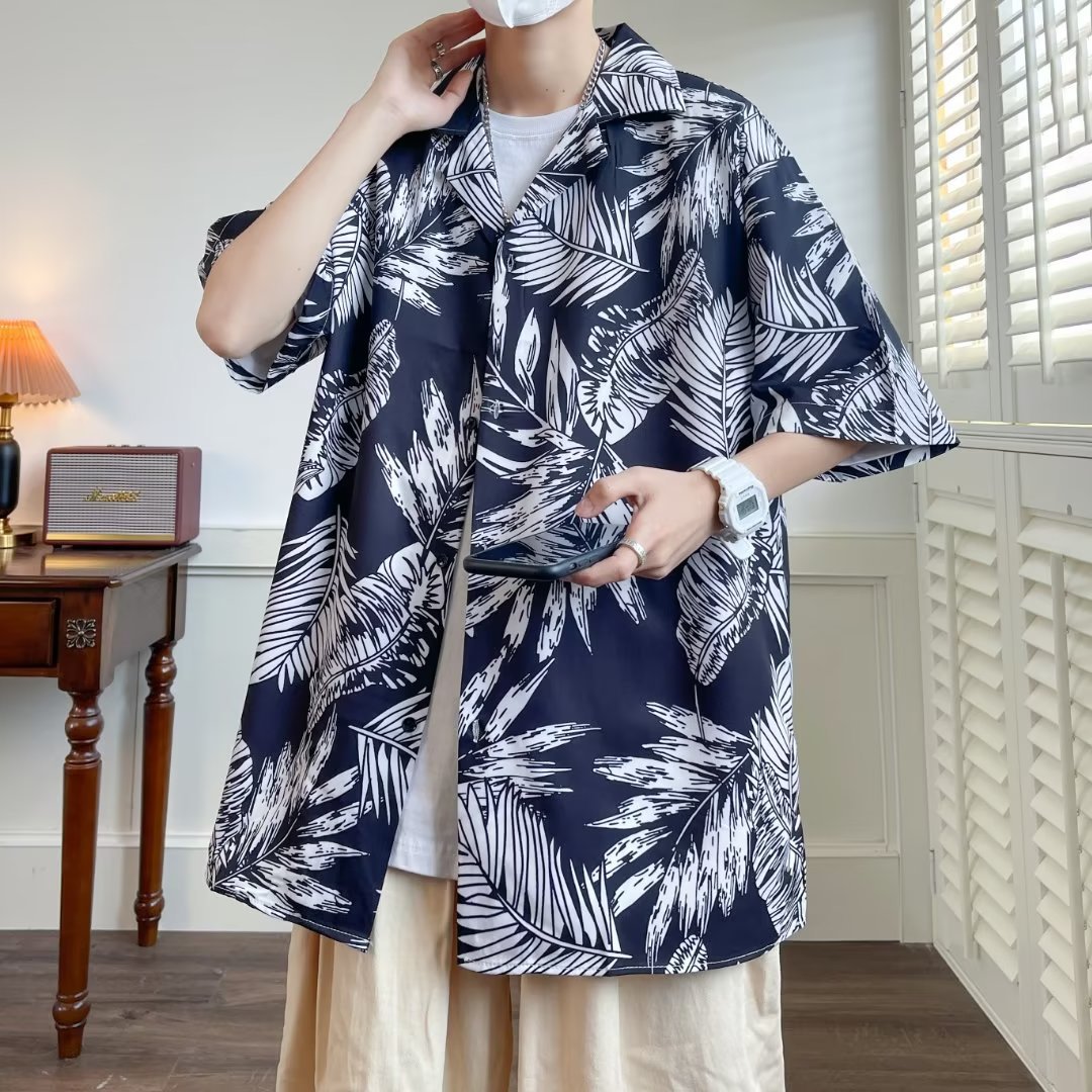 夏威夷碎花短袖衬衫男夏季薄款胖子宽松大码衬衣港风潮牌帅气外套