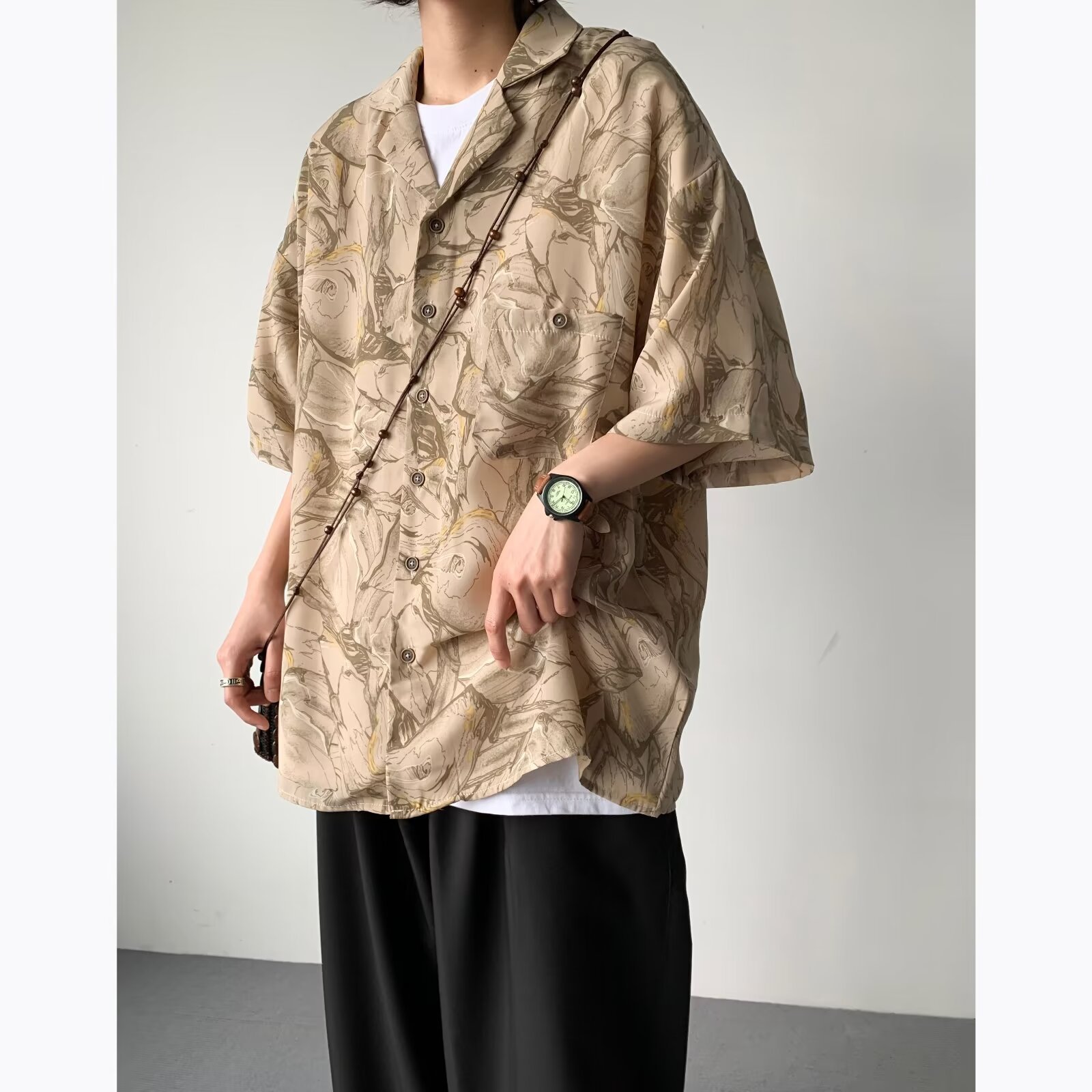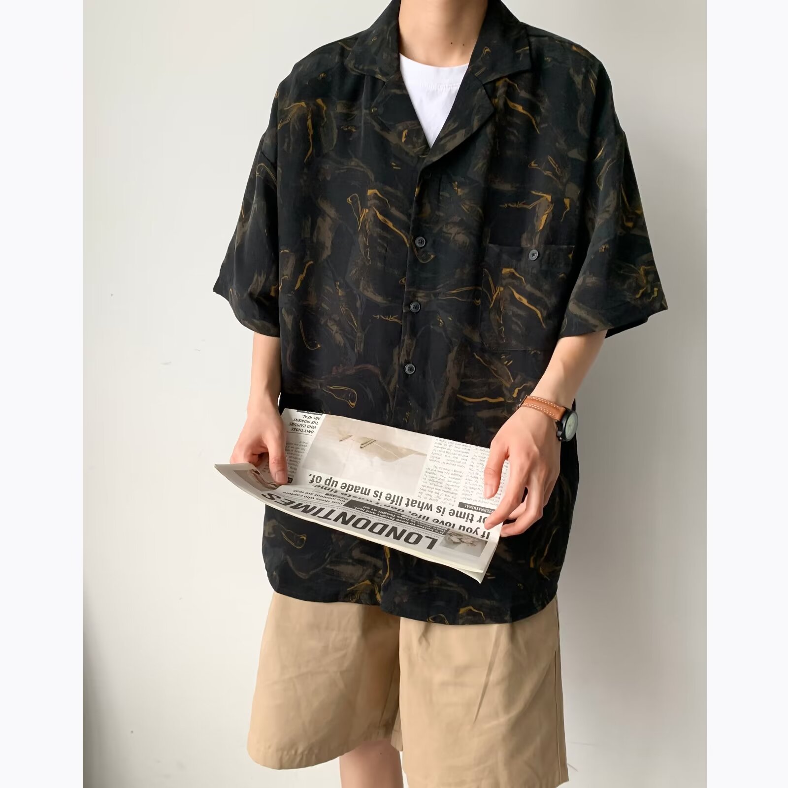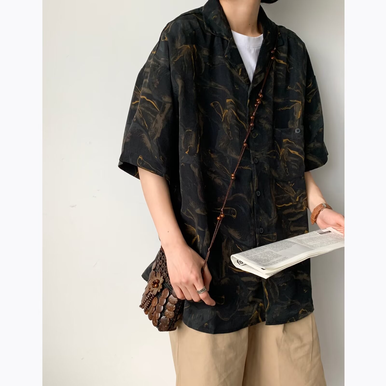 日系复古慵懒风线条几何短袖衬衫男夏日薄款宽松百搭潮流衬衣外套