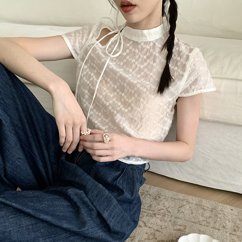诠释美 NEW OPEN夏季新中式天丝立领上衣女纯色绣花小衫82636