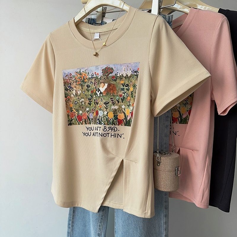 美式复古开叉不规则短袖T恤女夏季ins潮牌小众设计感上衣