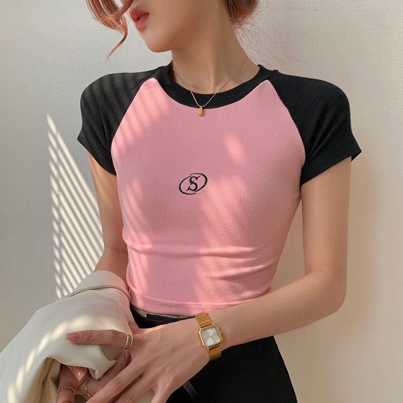 纯棉粉色刺绣正肩短款短袖t恤女夏季修身显瘦插肩袖上衣女