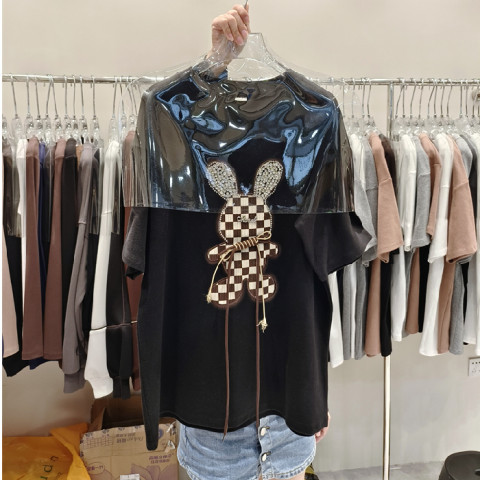 欧洲站大码重工磨毛加厚T恤女秋冬季慵懒风宽松叠穿短袖上衣打底