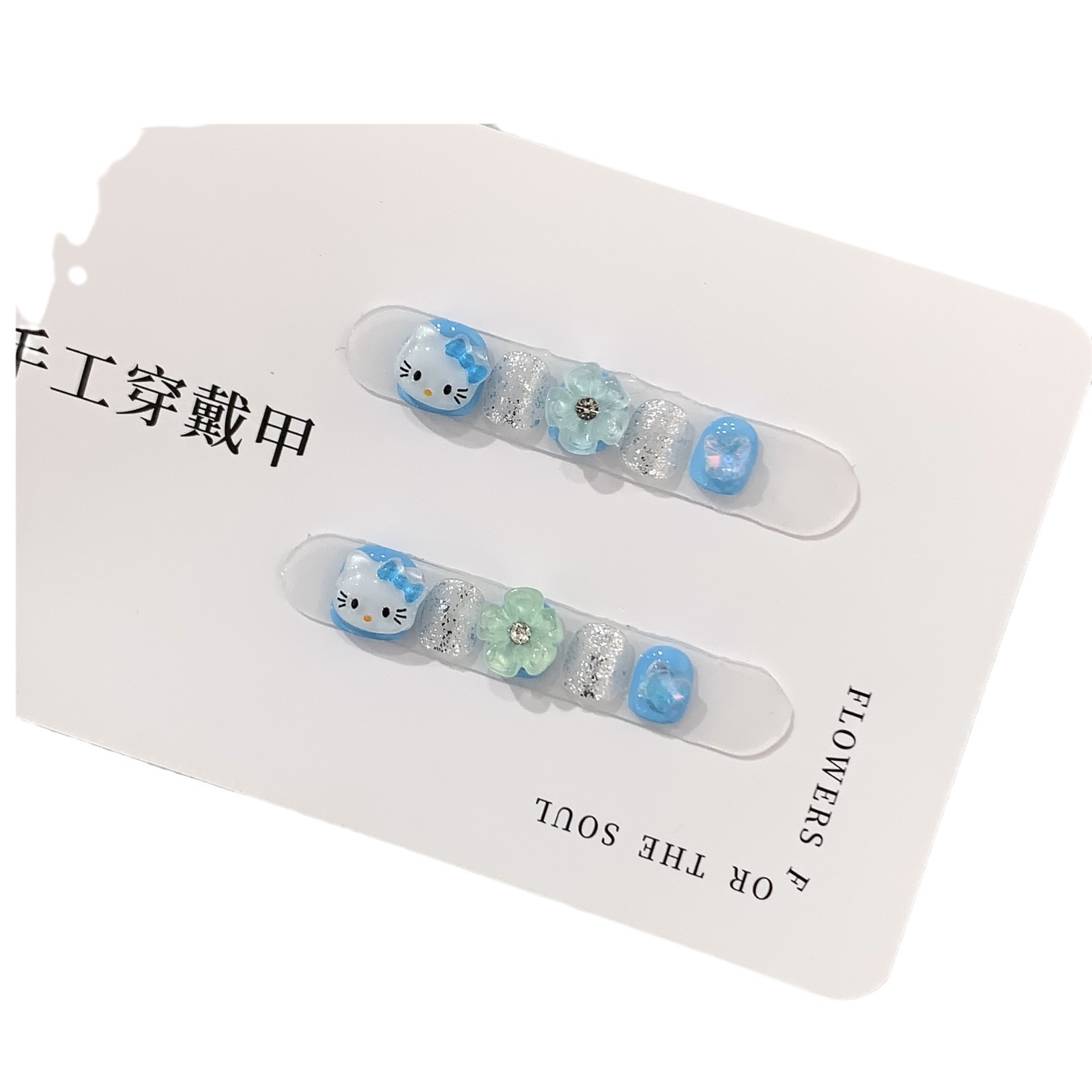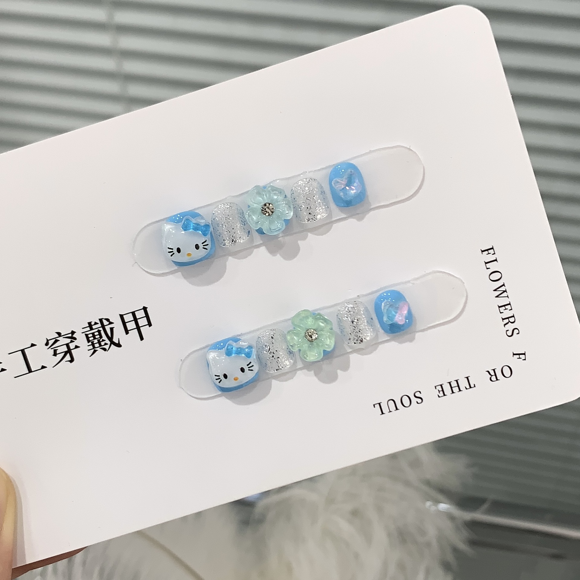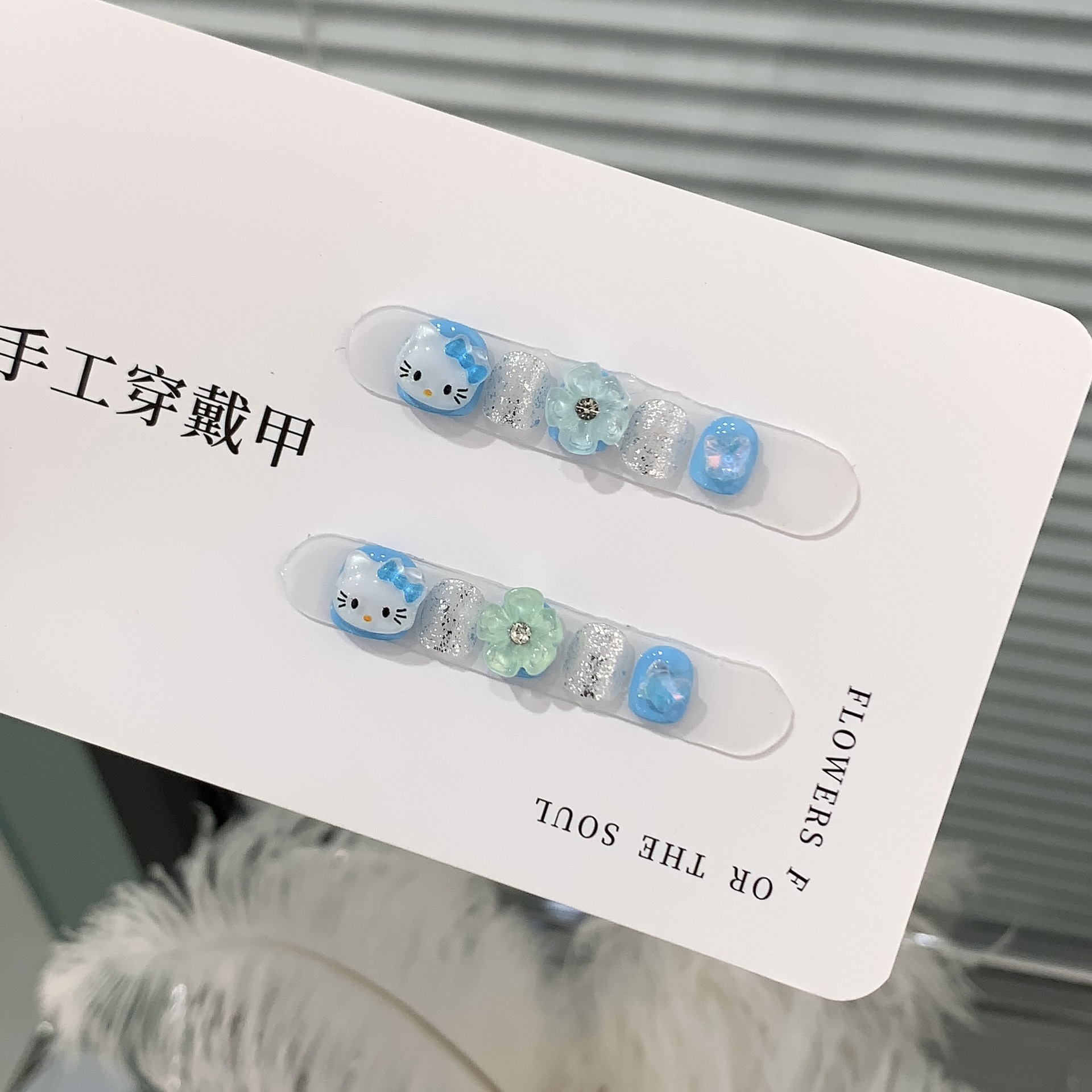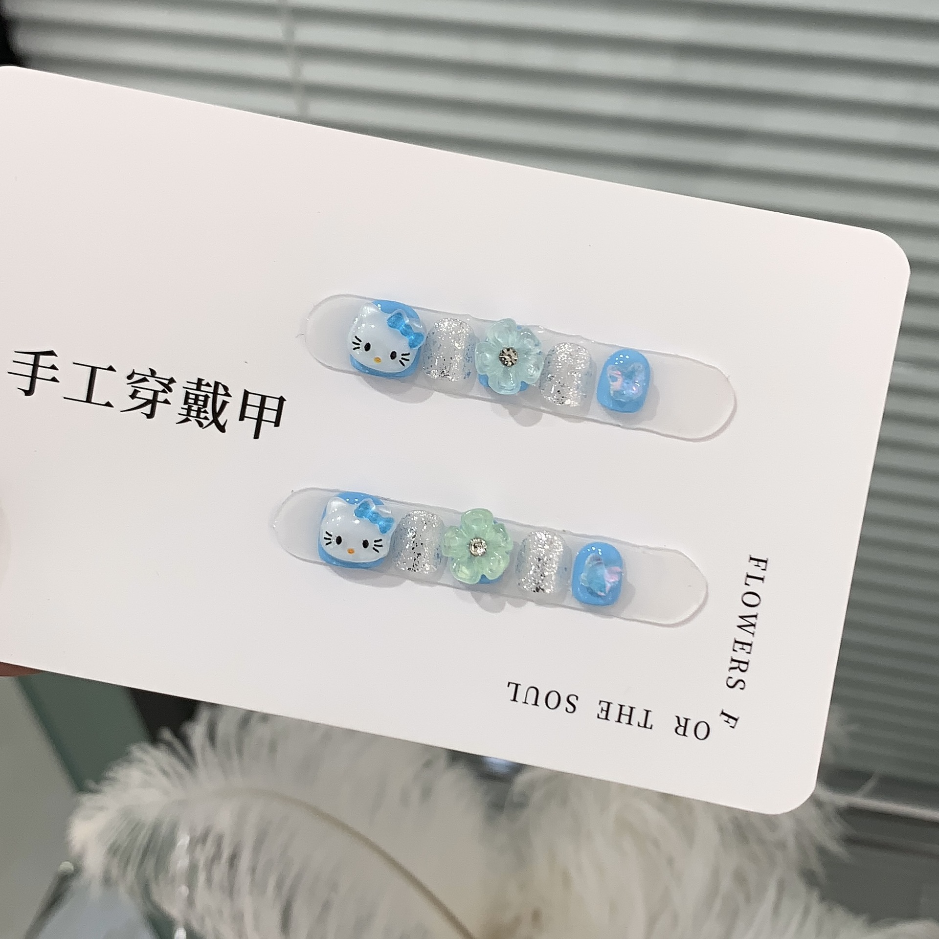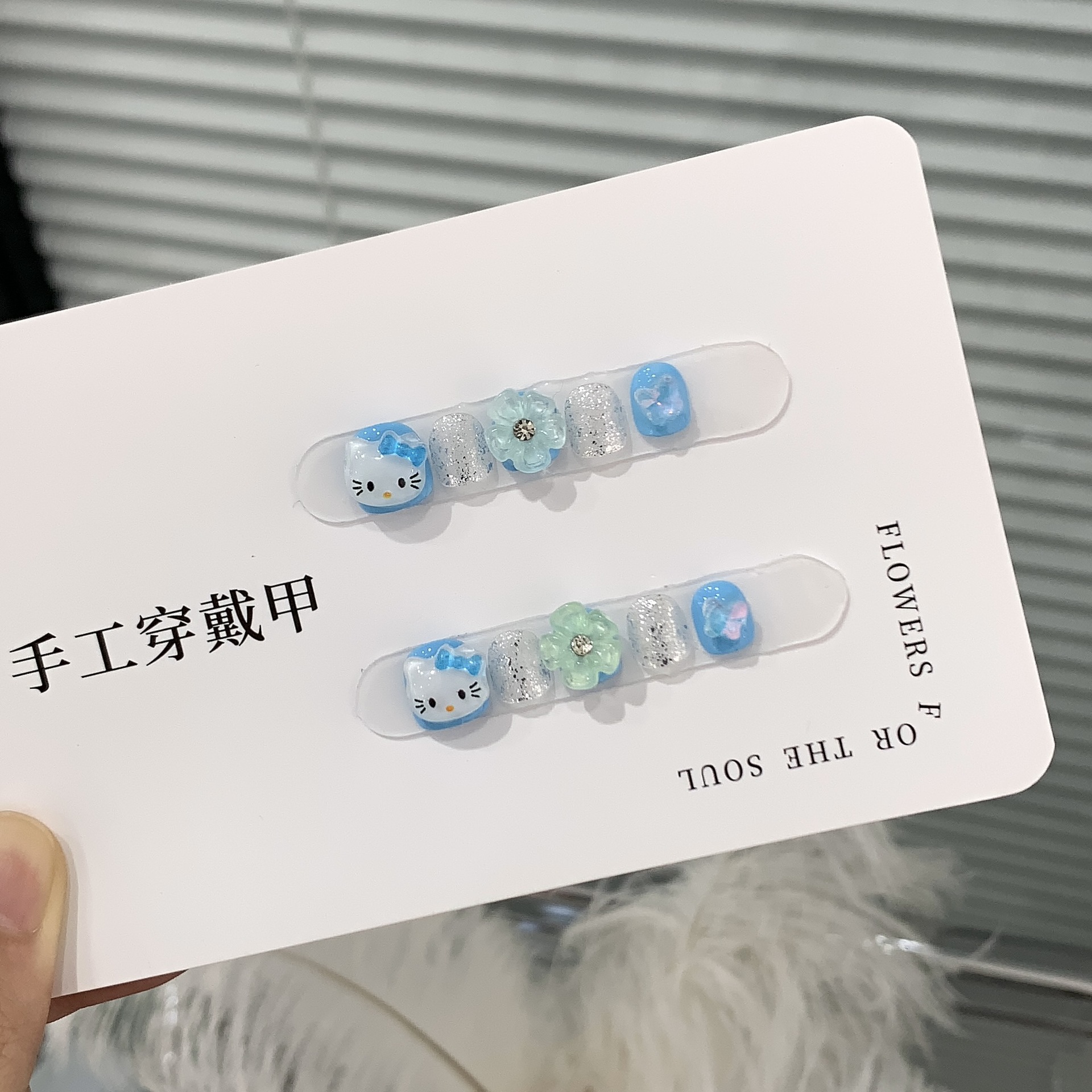 一只顾美甲可爱卡通银碎细闪花花海蓝Kitty儿童日常穿戴甲