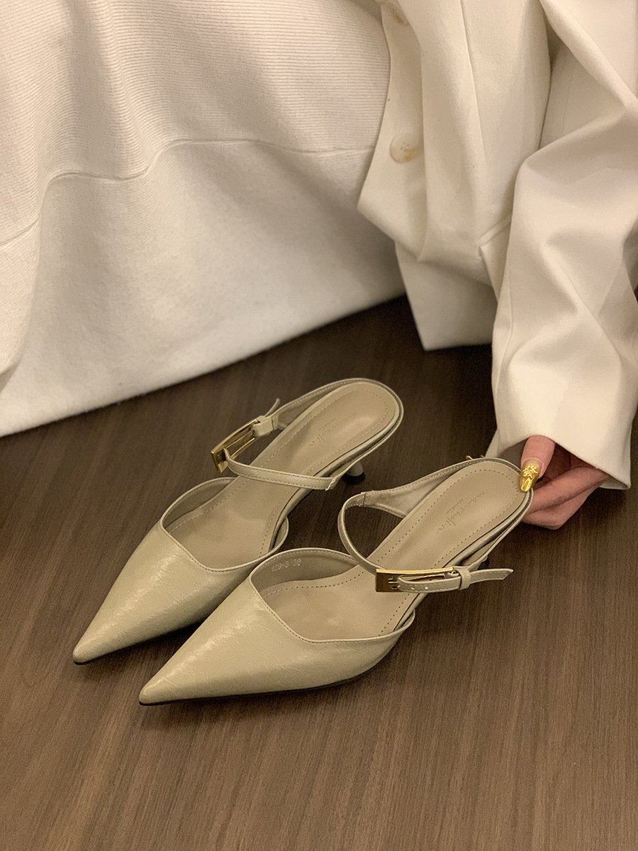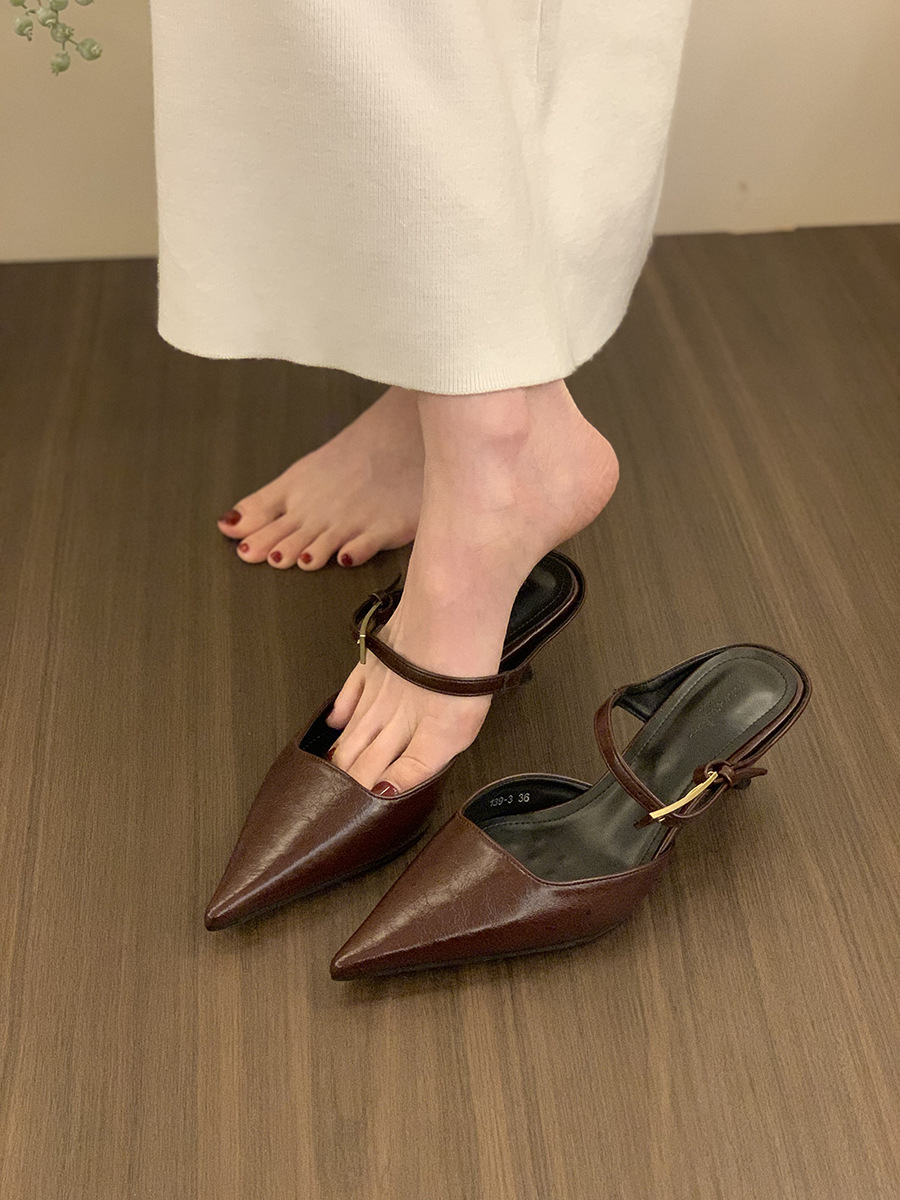 法式小众包头凉鞋女夏新款尖头一字扣拼色细跟浅口高跟鞋