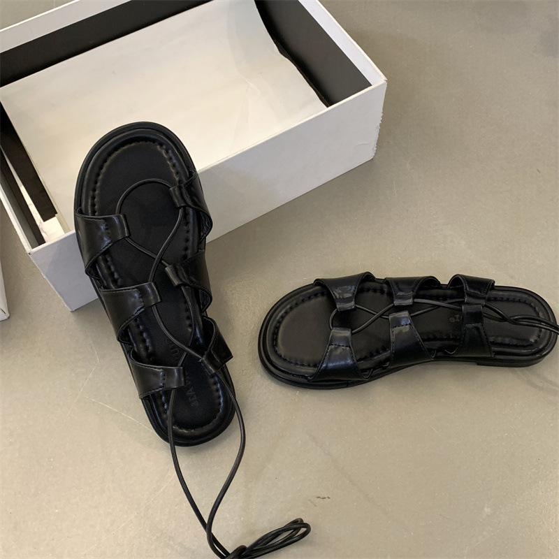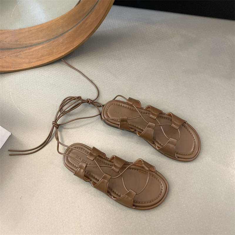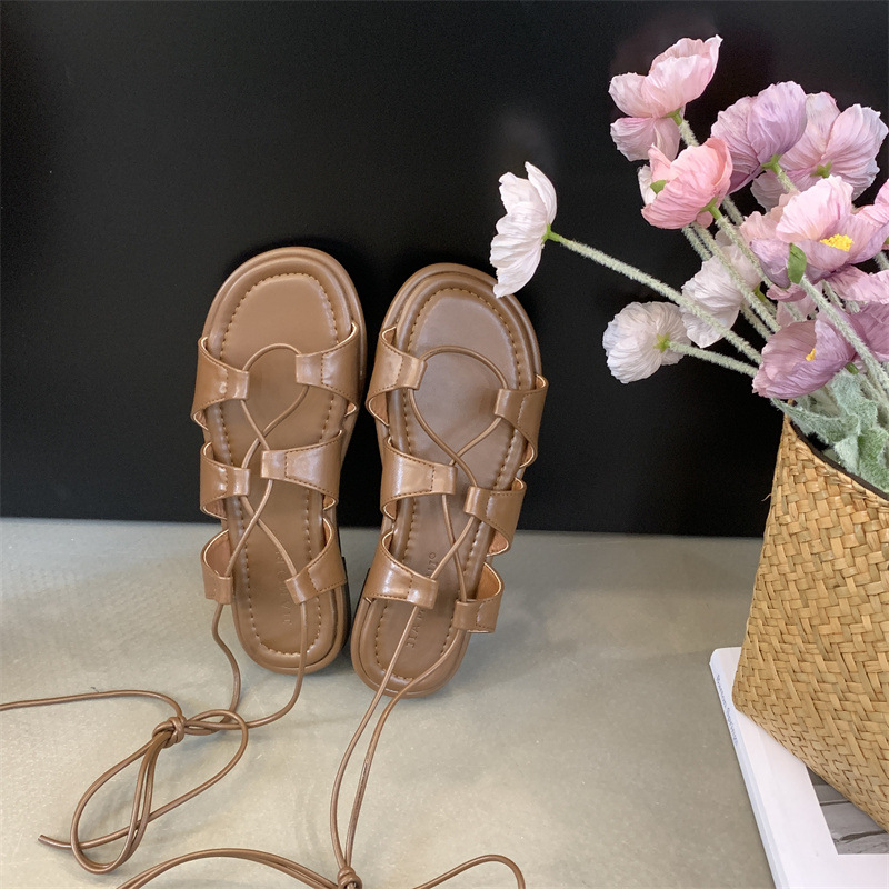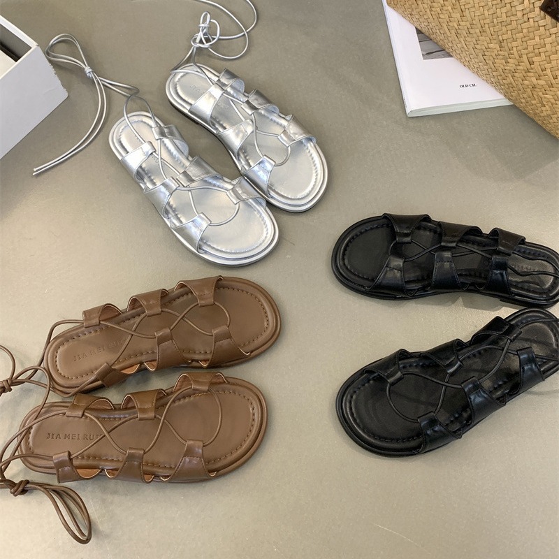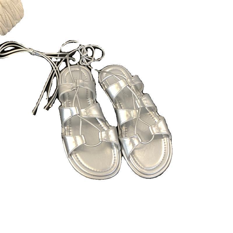 平底露趾银色细带凉鞋仙女鞋子夏款配裙子法式旅游绑带罗马鞋