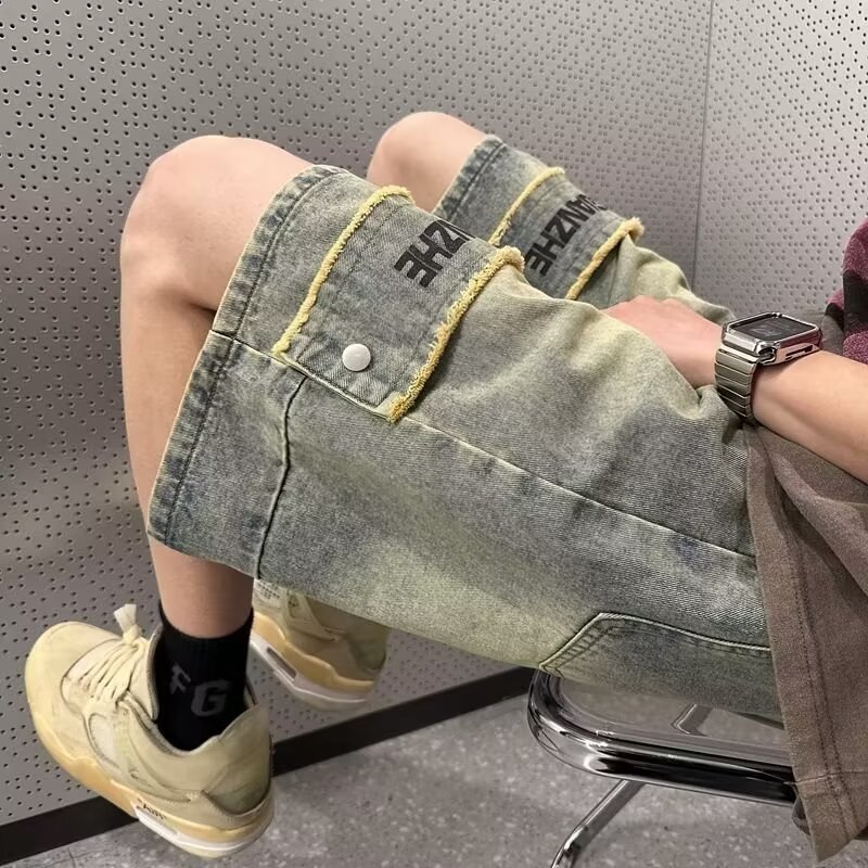美式复古牛仔短裤男夏季潮牌设计感欧美痞帅hiphop直筒宽松五分裤