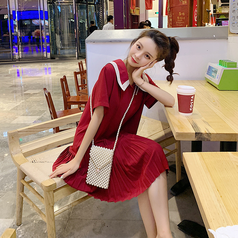 新款雪纺娃娃领酒红连衣裙夏季宽松女装小个子显瘦休闲百褶裙