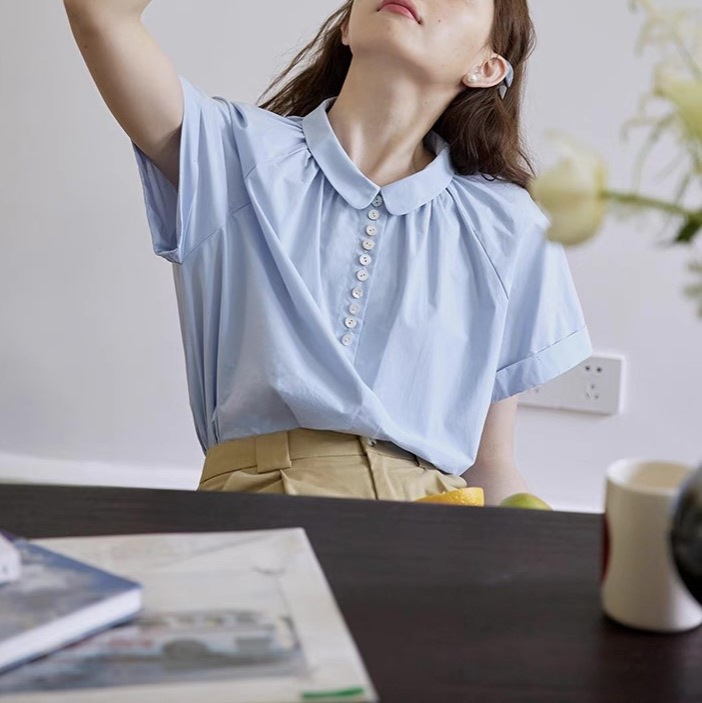 品质推荐~法式复古娃娃领贝壳扣设计感衬衫夏季显瘦短袖女