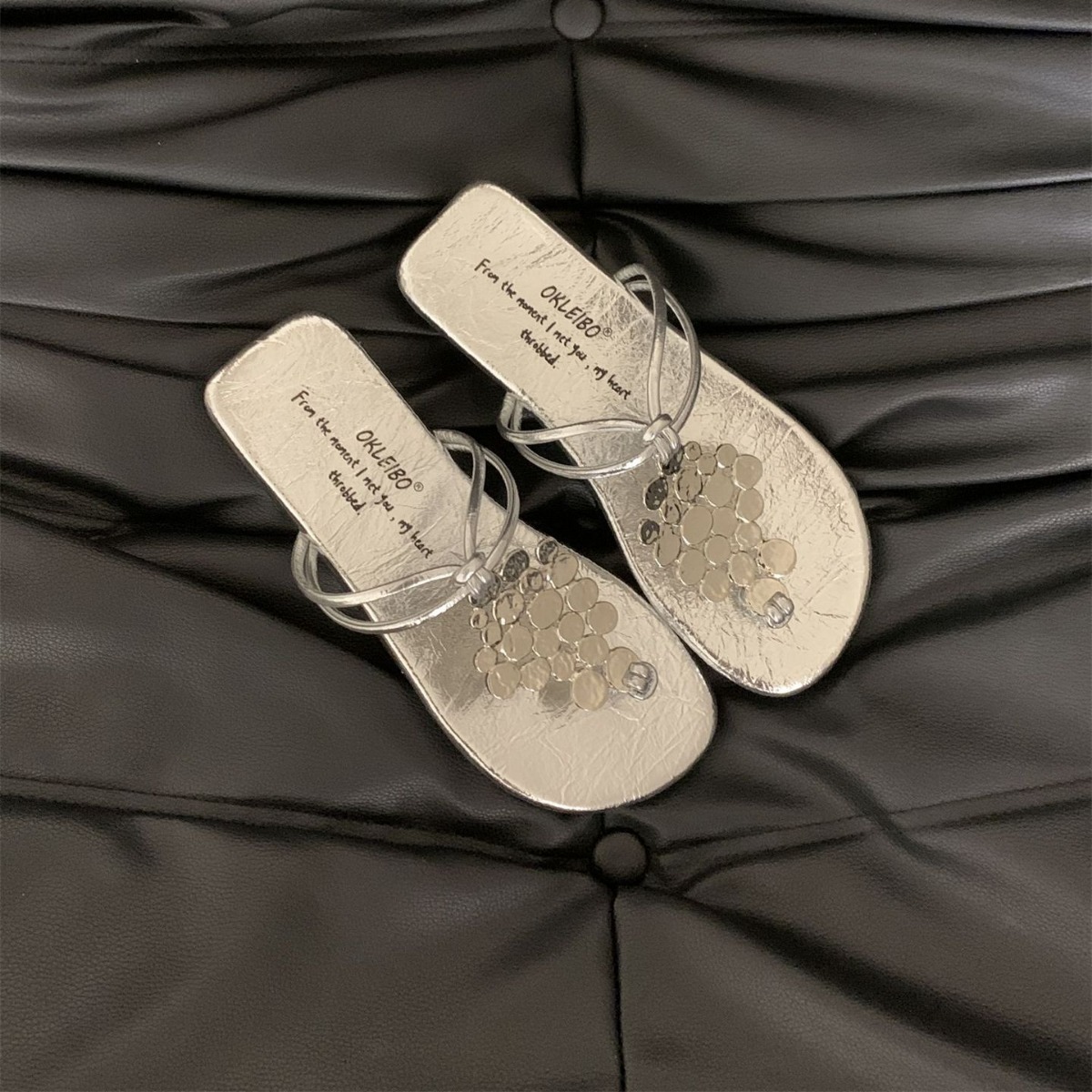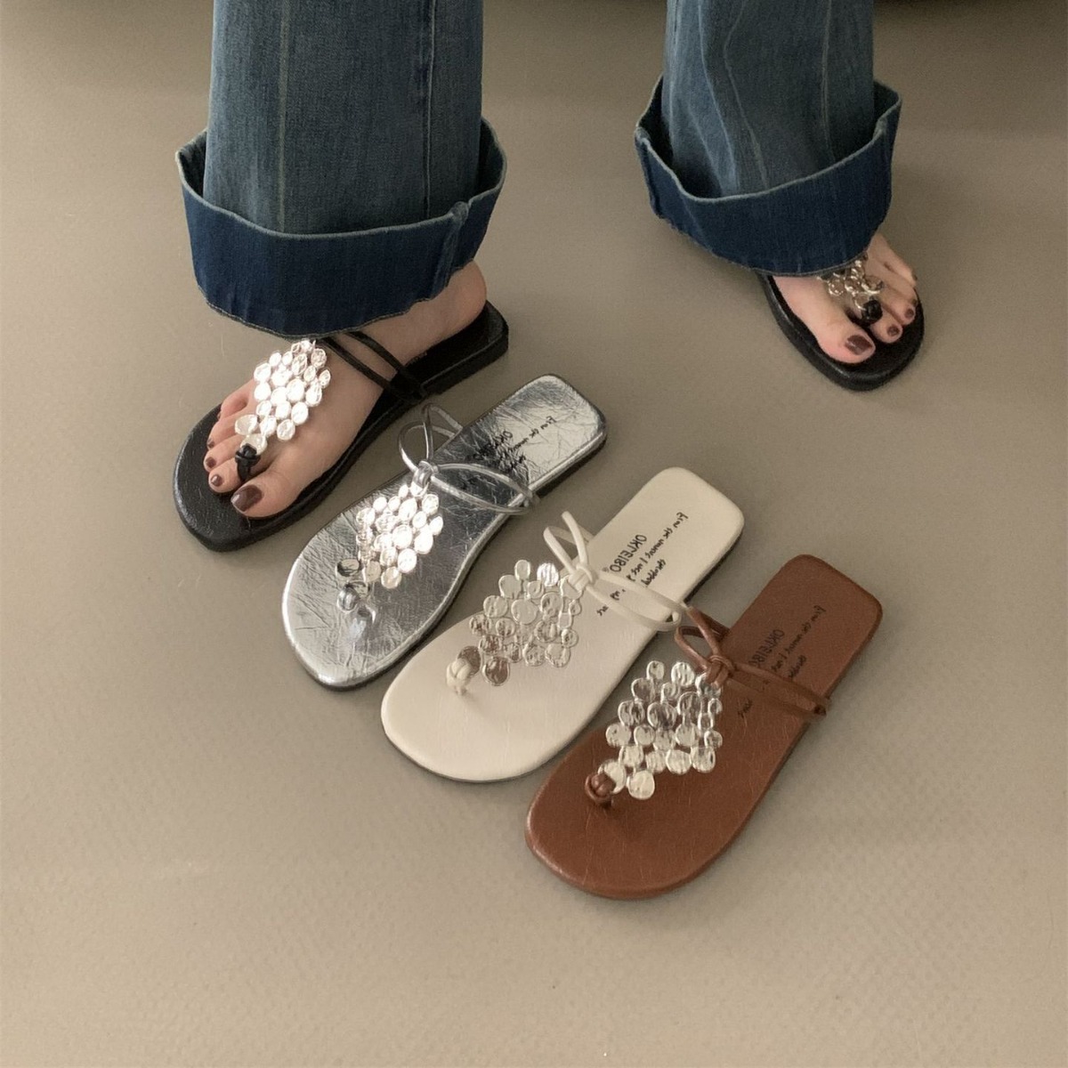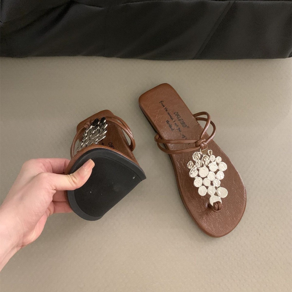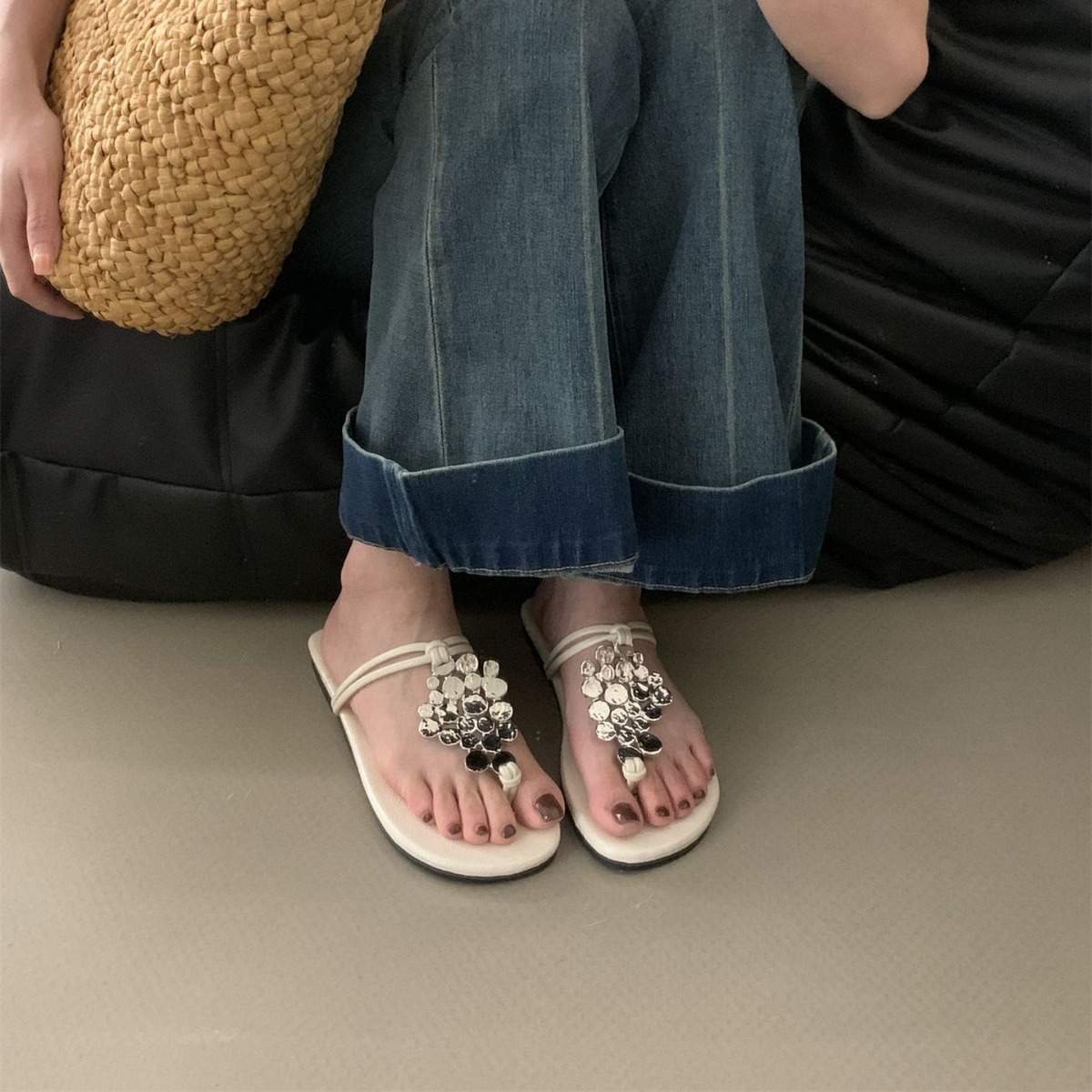 韩版小众夹趾拖鞋女夏露趾金属扣度假沙滩罗马波西米亚凉拖鞋