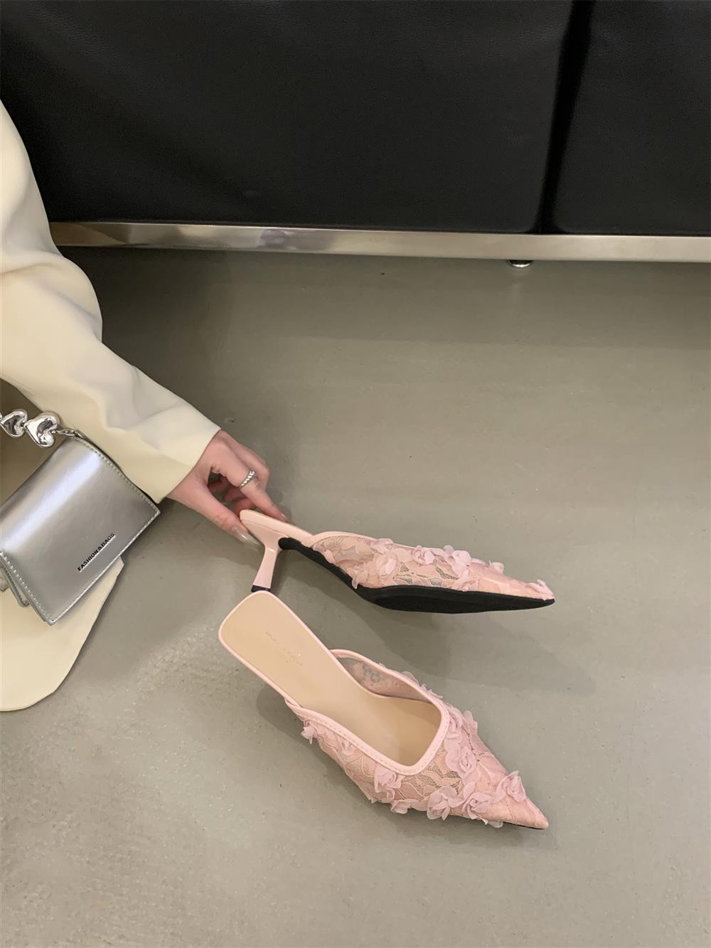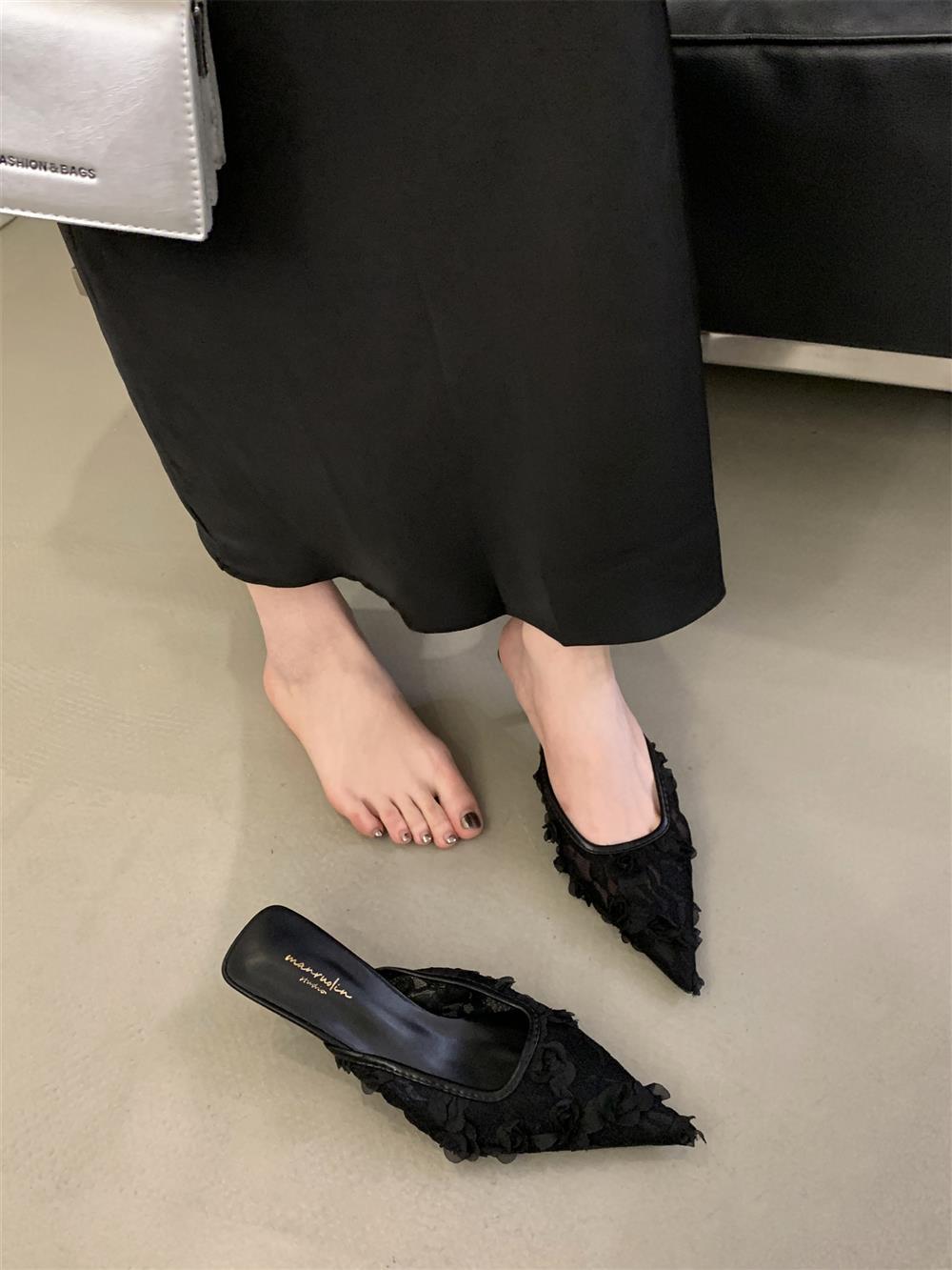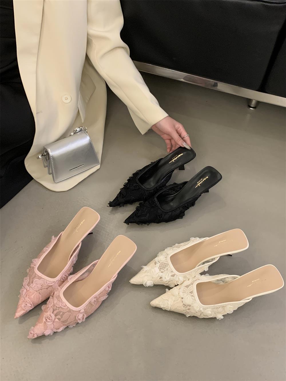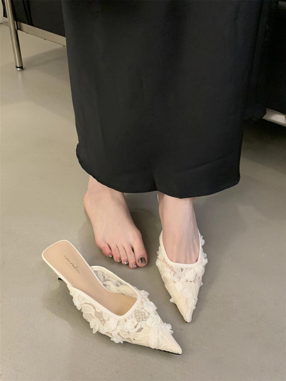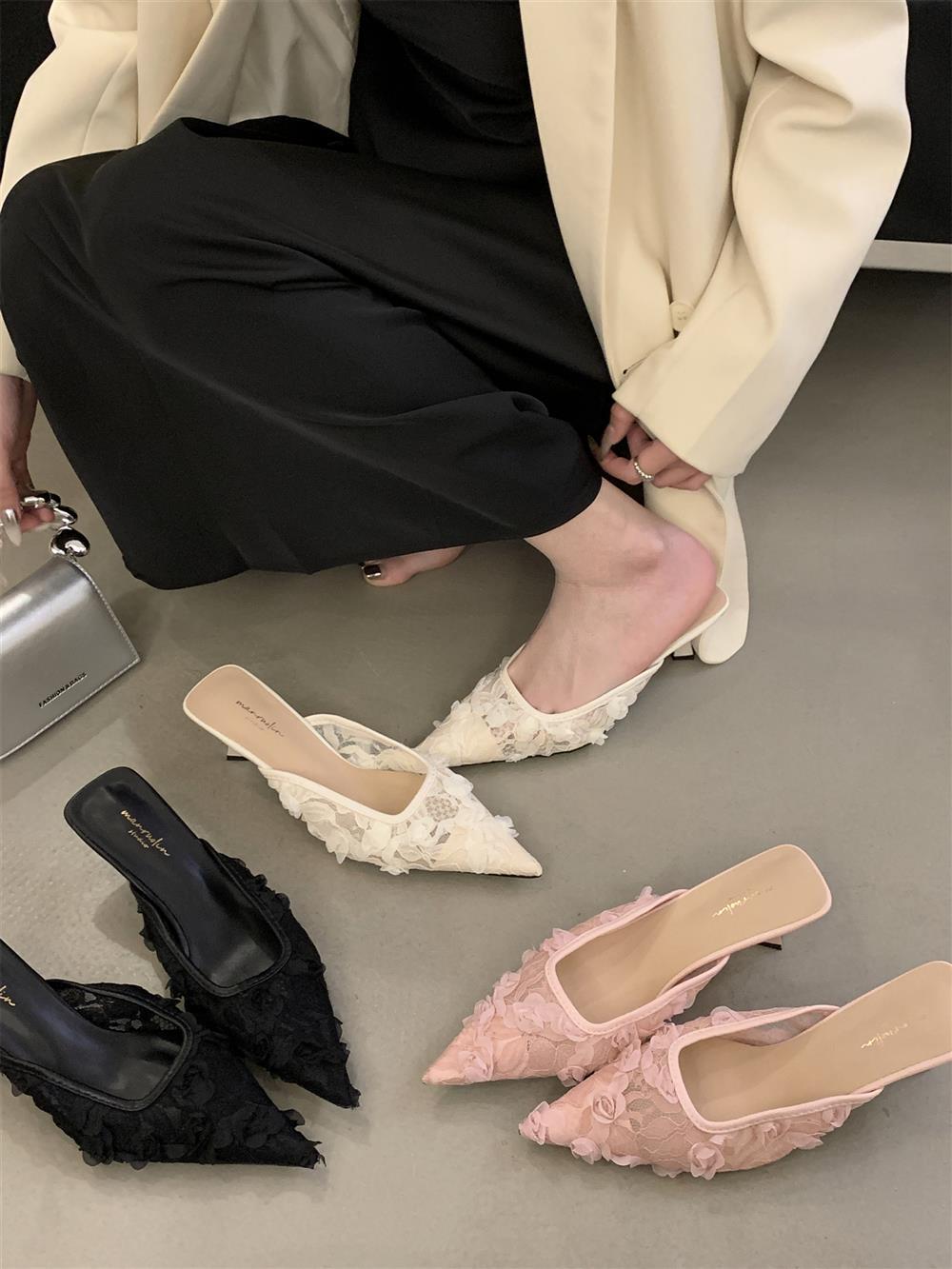 2025年春季新款法式网纱花朵包头半拖鞋女外穿细跟尖头配裙子凉拖