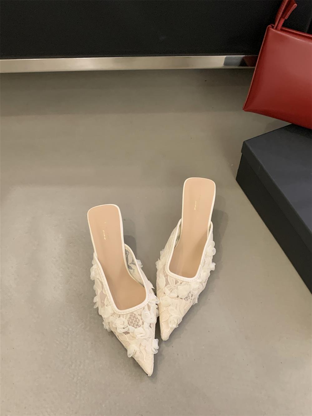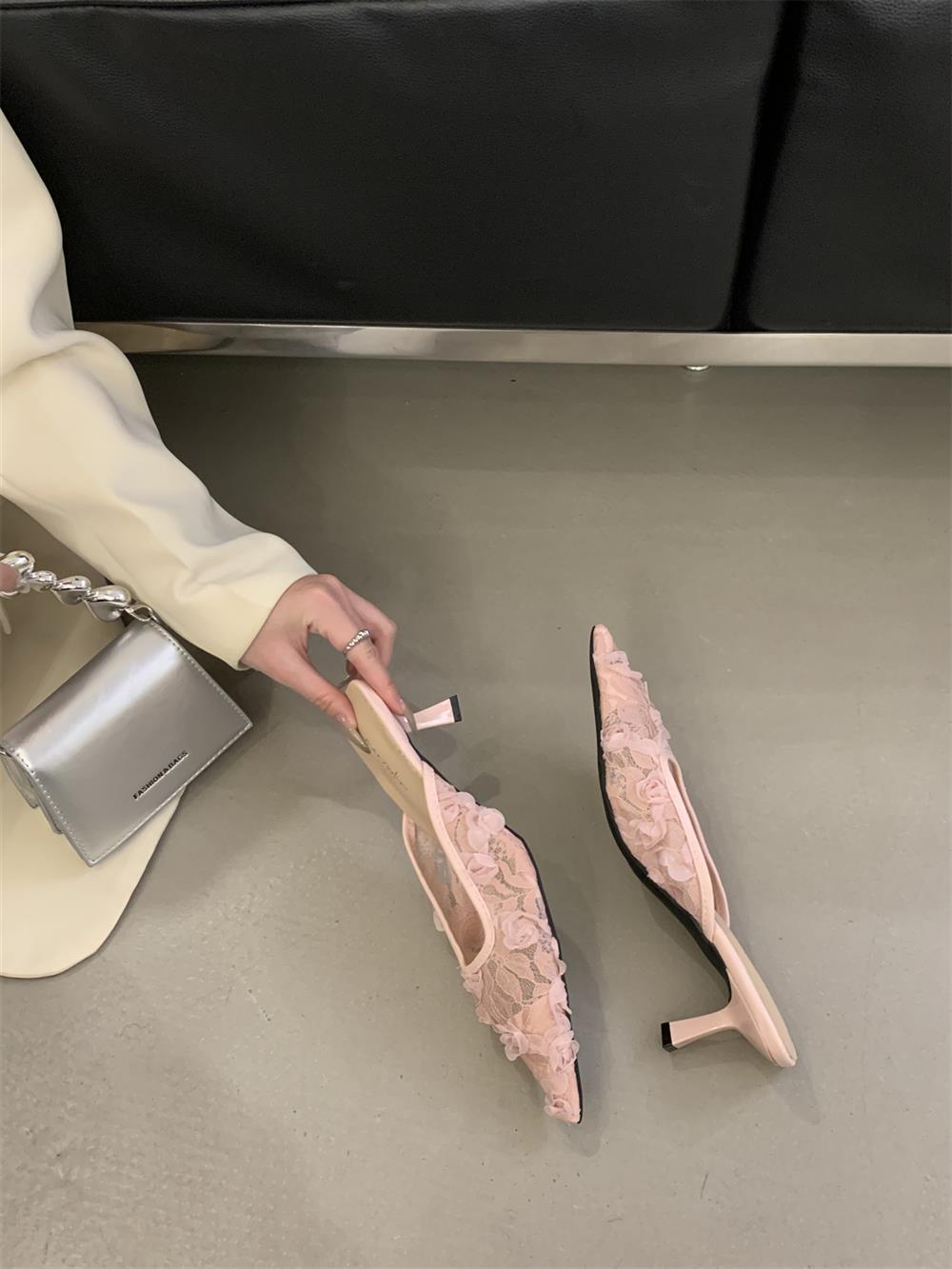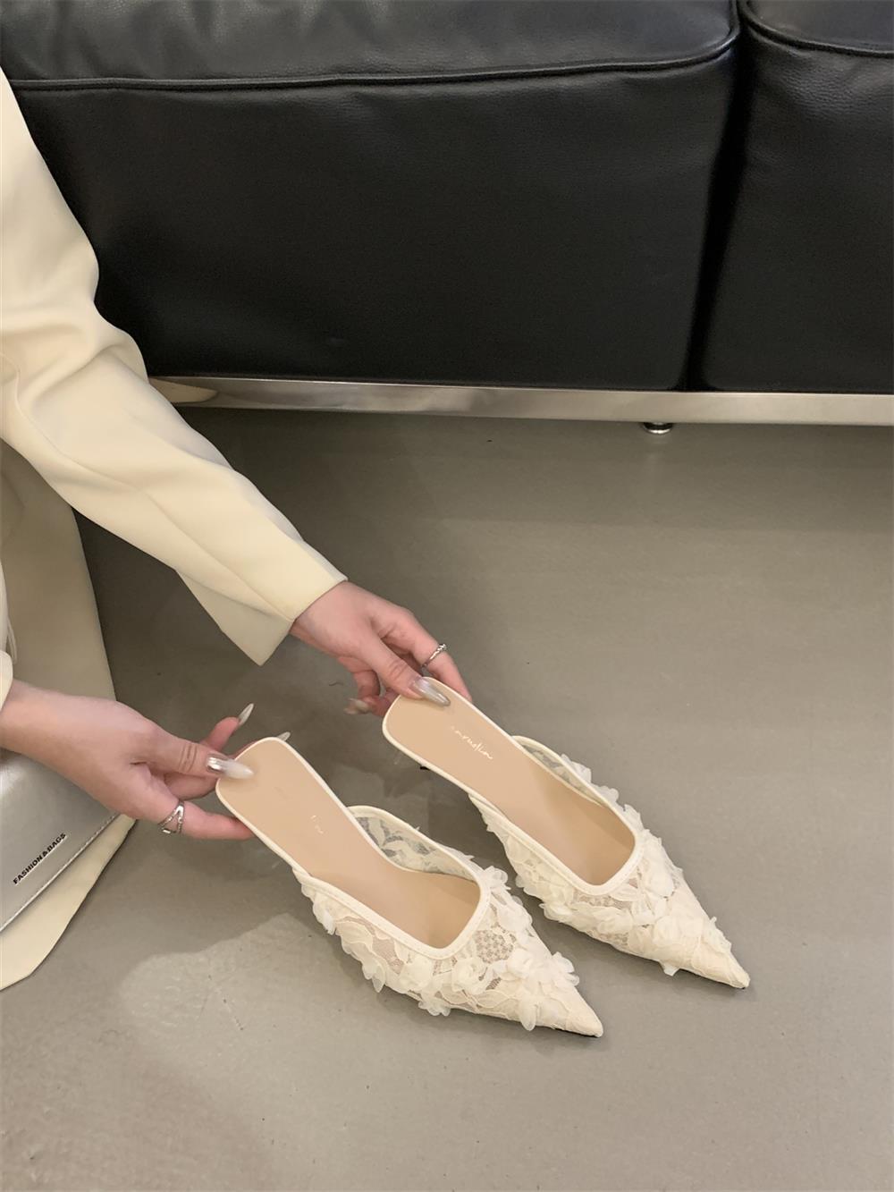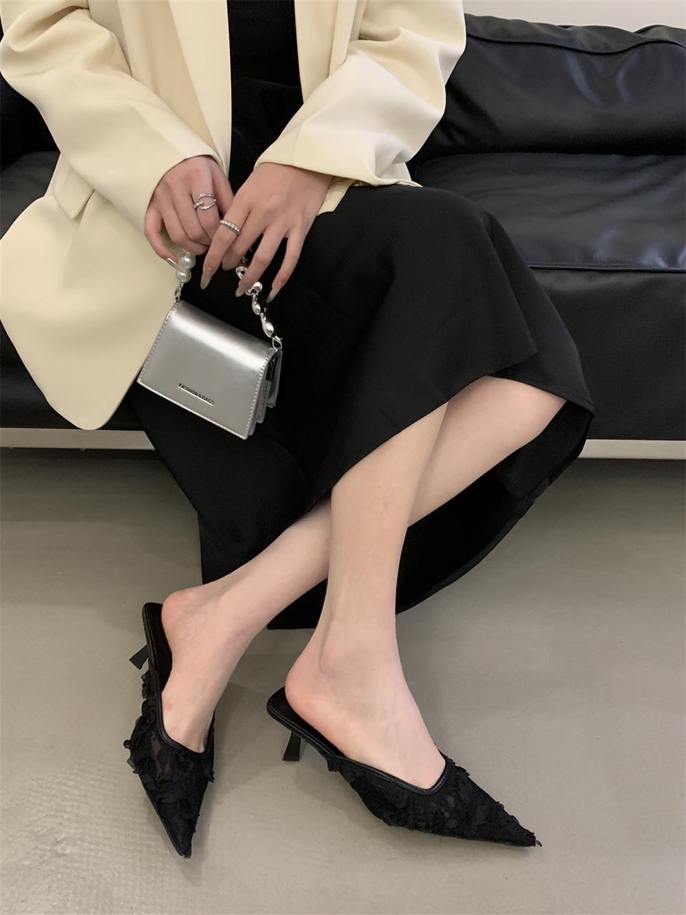 2025年春季新款法式网纱花朵包头半拖鞋女外穿细跟尖头配裙子凉拖