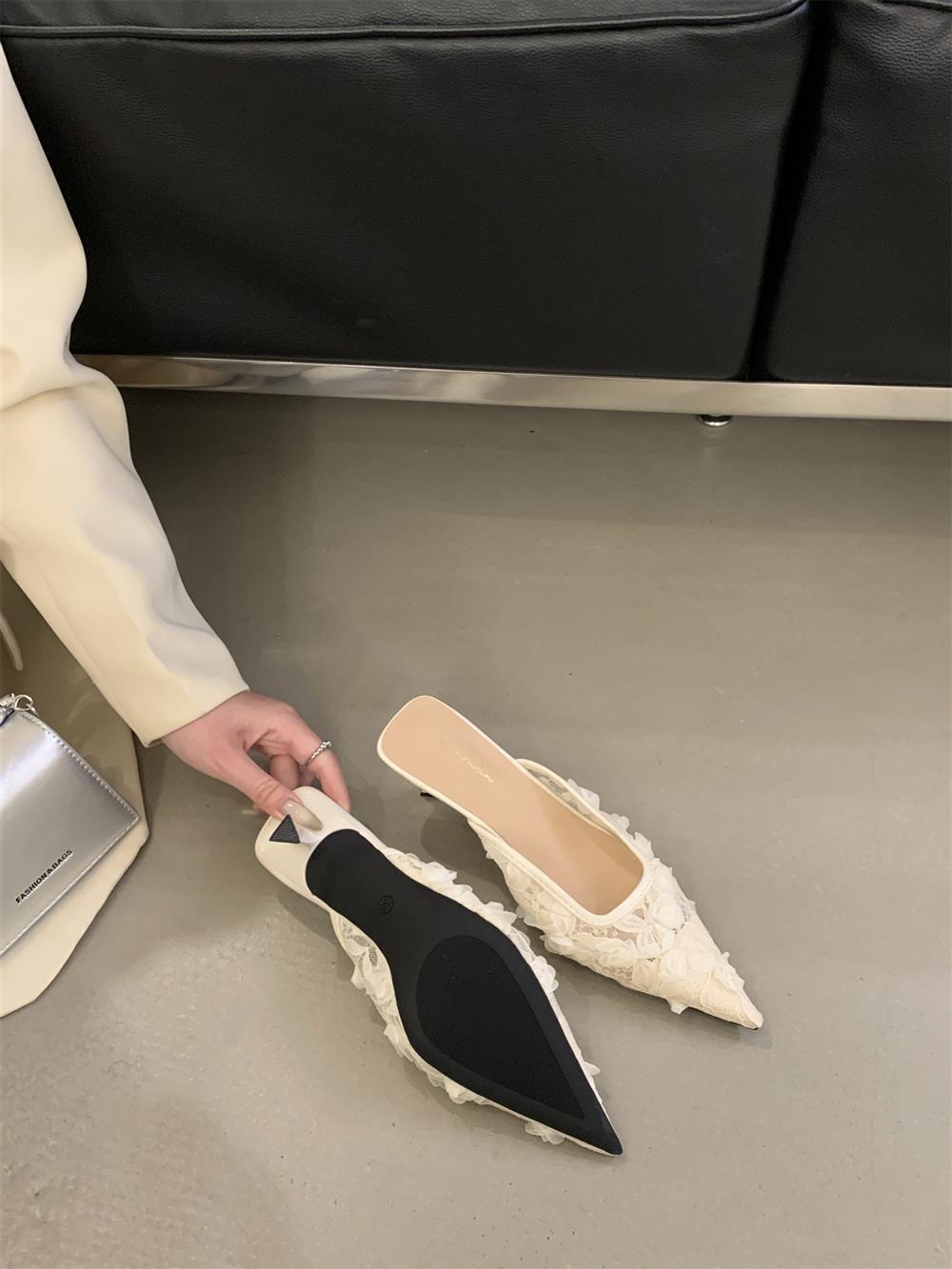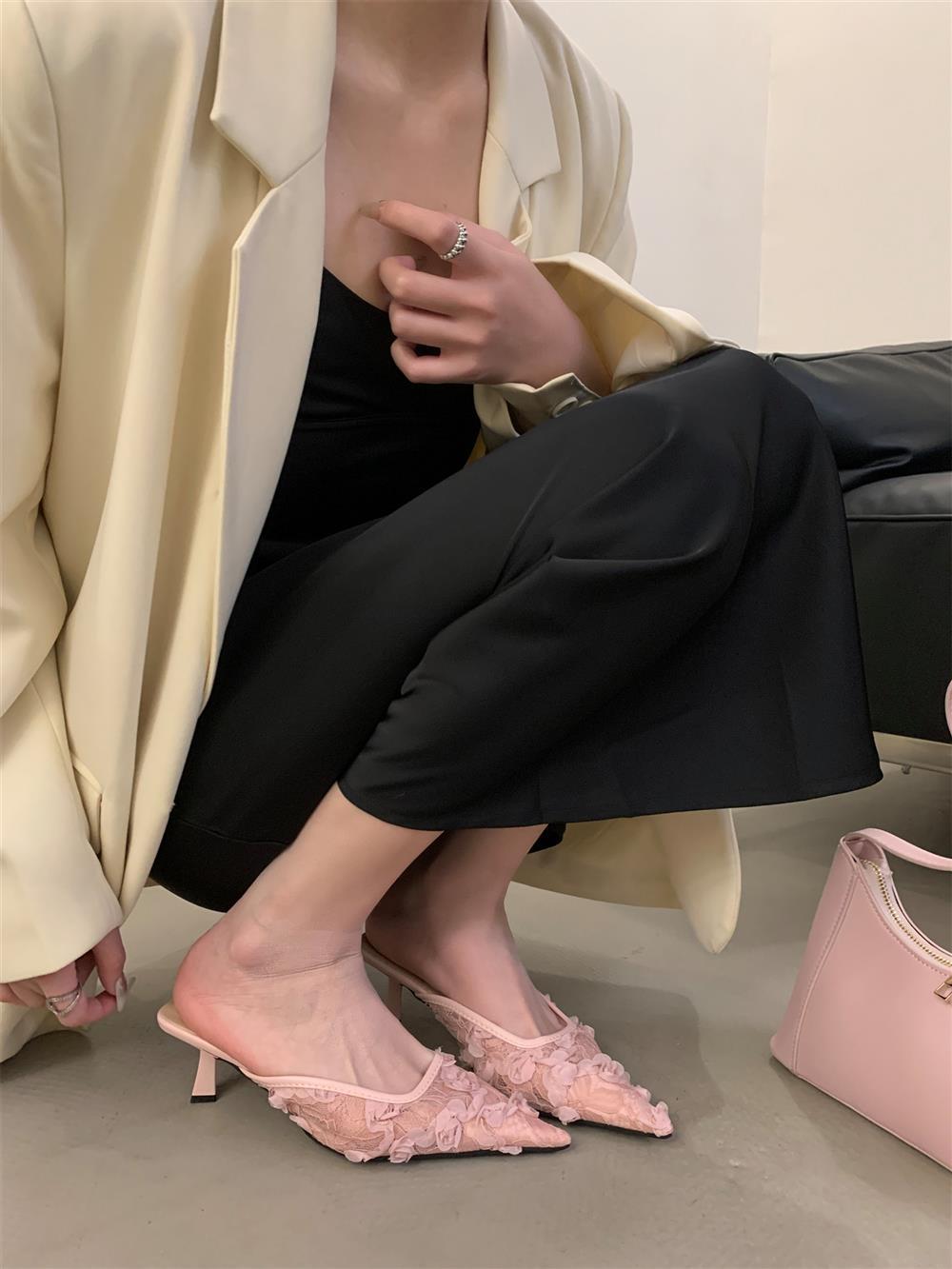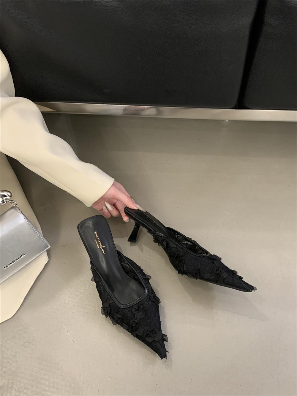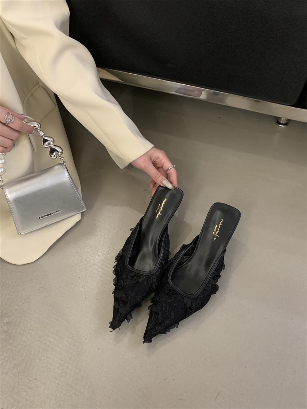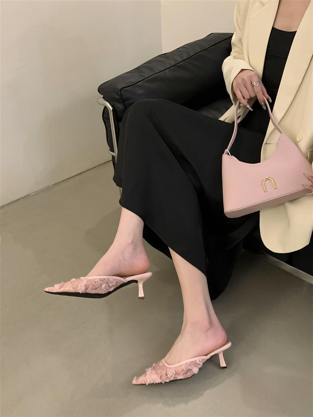 2025年春季新款法式网纱花朵包头半拖鞋女外穿细跟尖头配裙子凉拖