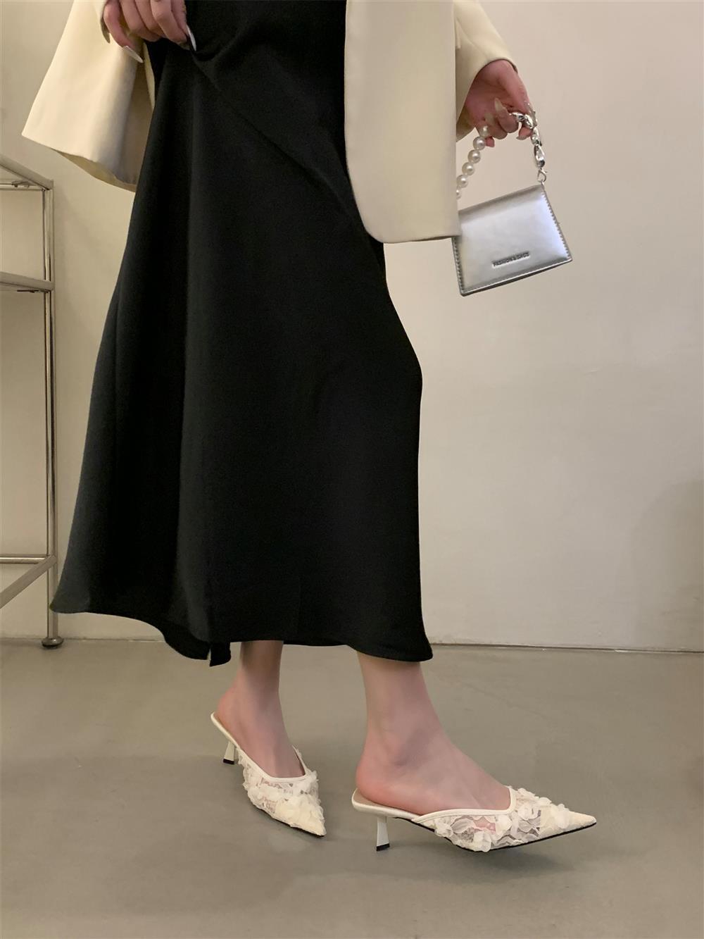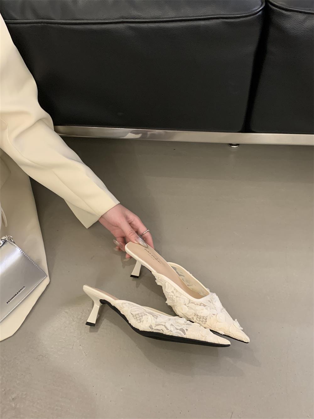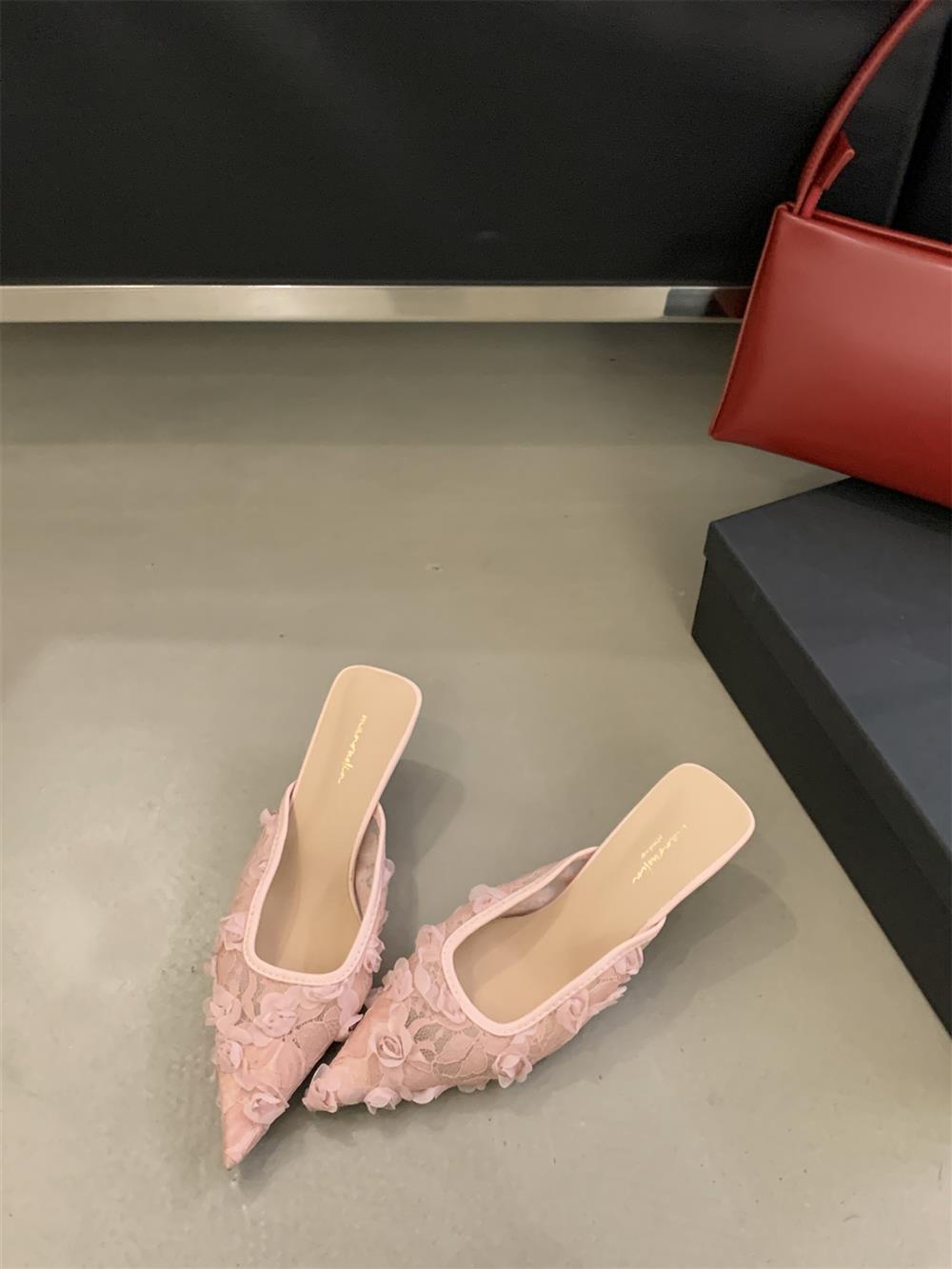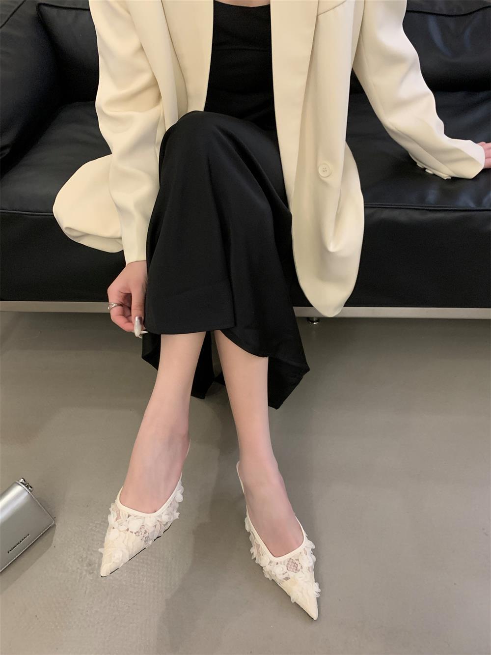 2025年春季新款法式网纱花朵包头半拖鞋女外穿细跟尖头配裙子凉拖