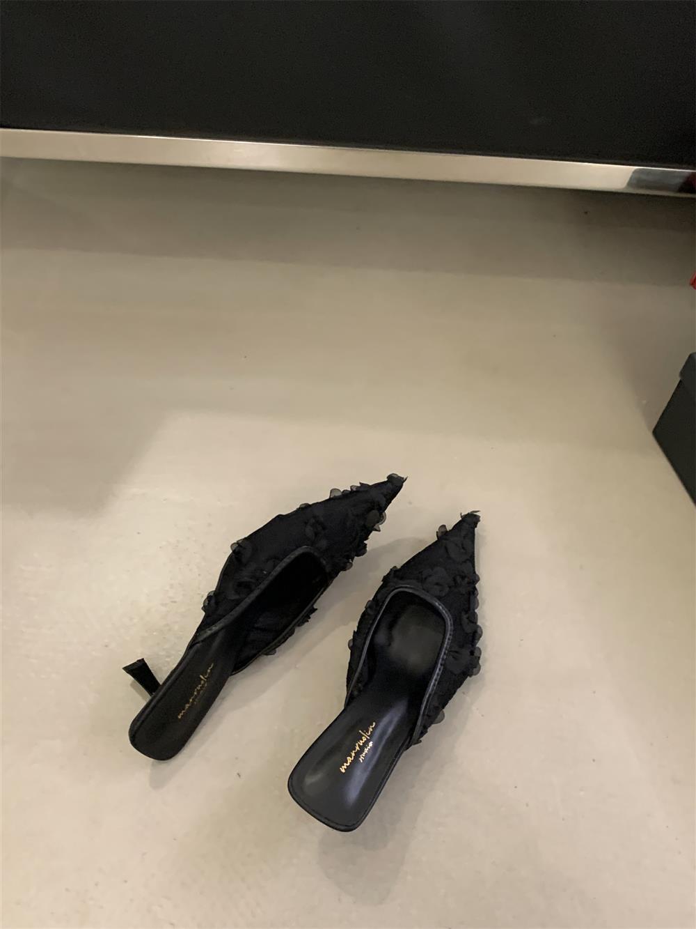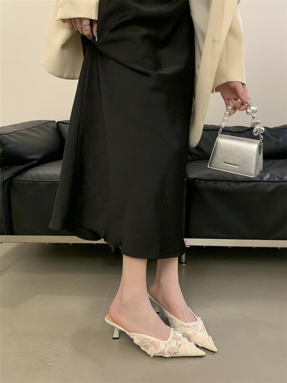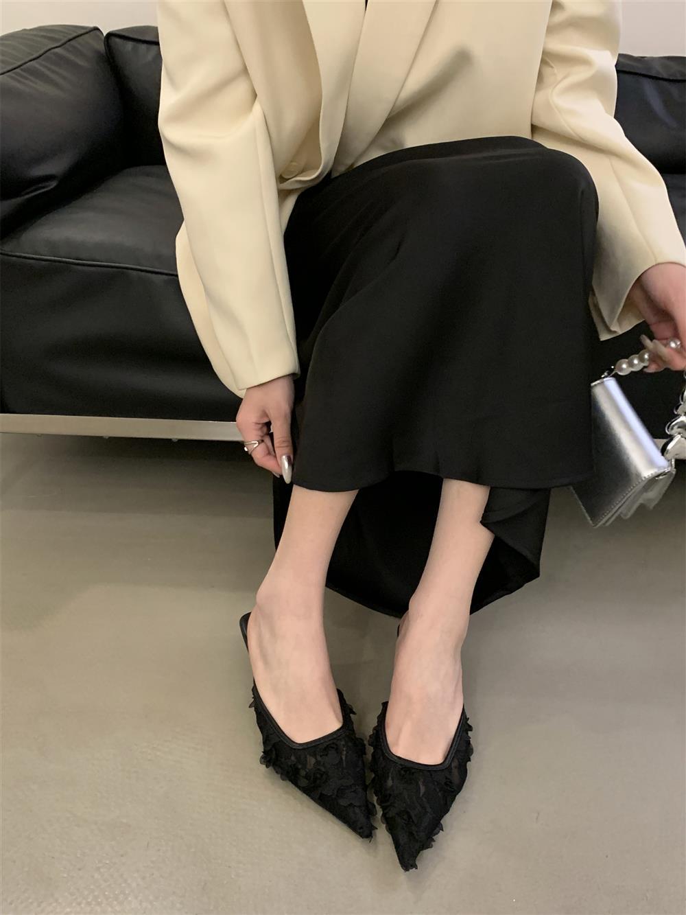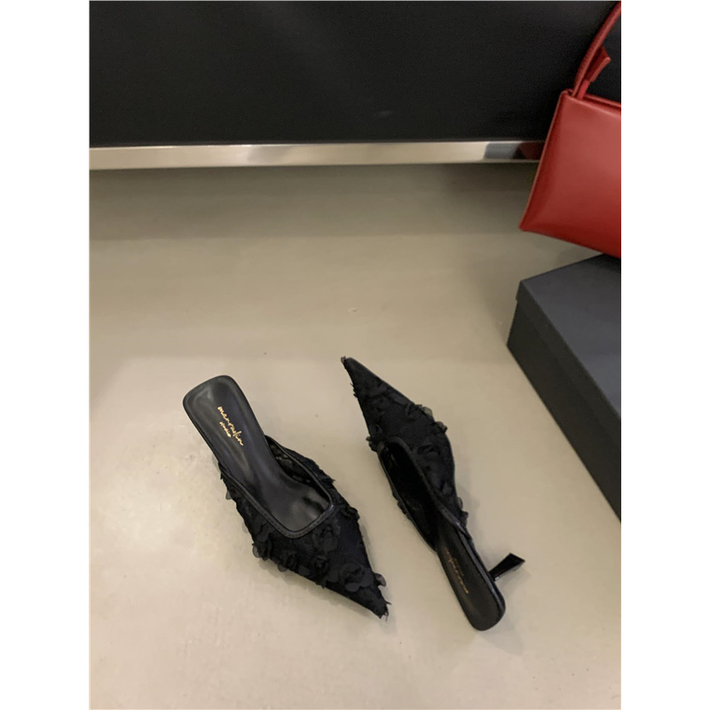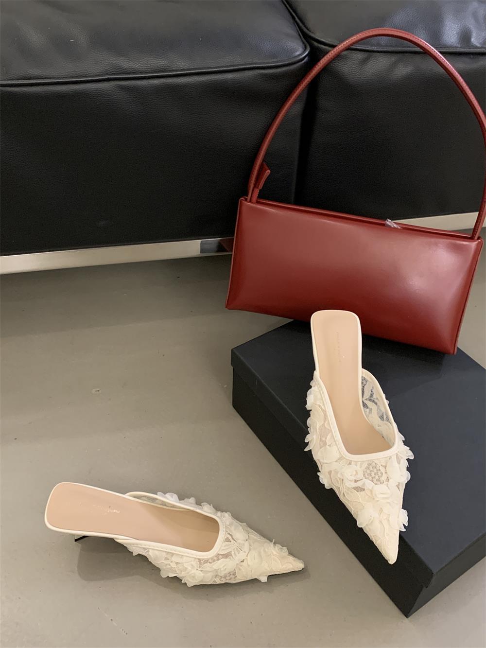 2025年春季新款法式网纱花朵包头半拖鞋女外穿细跟尖头配裙子凉拖