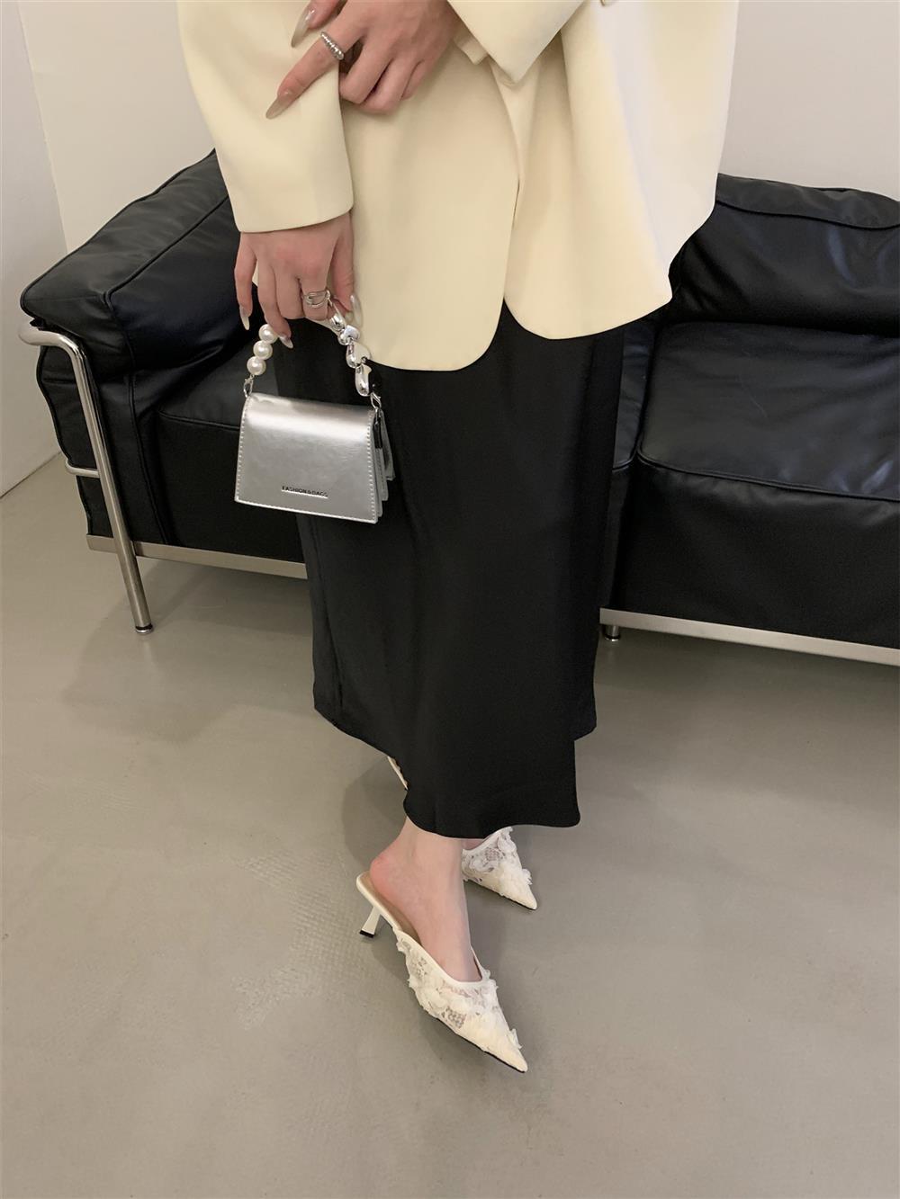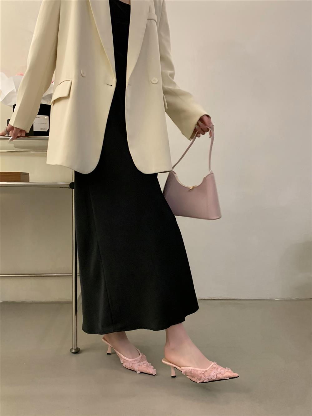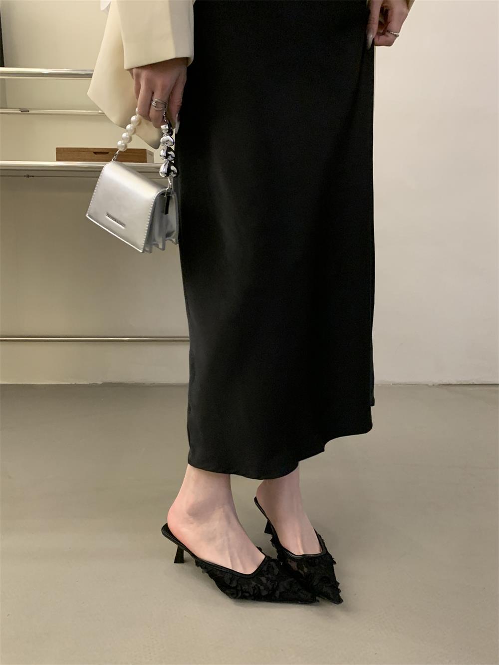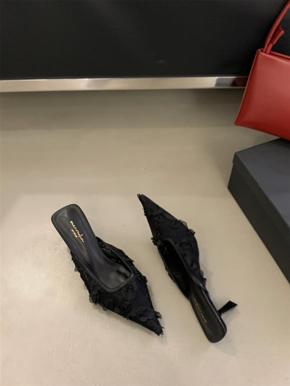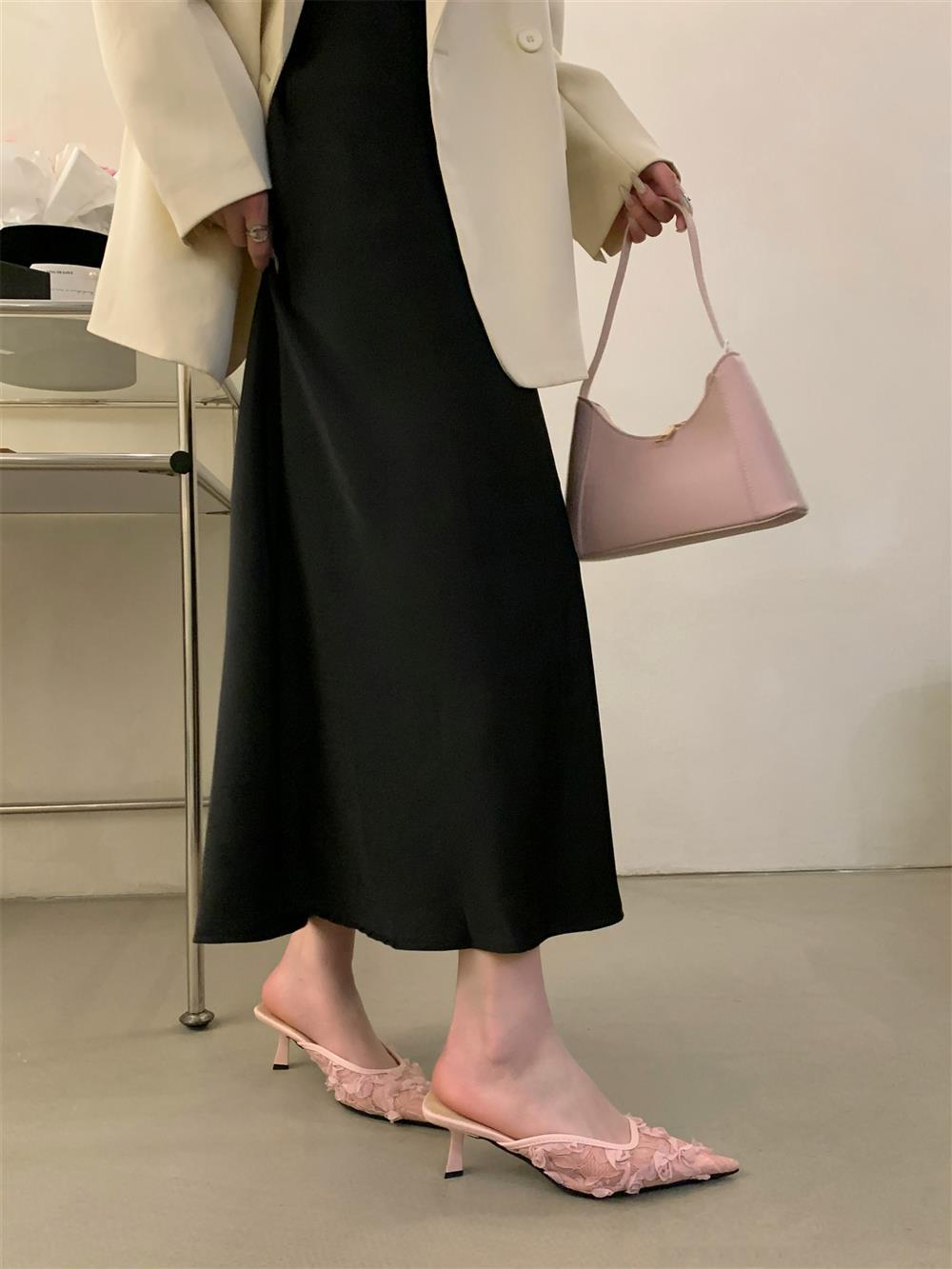 2025年春季新款法式网纱花朵包头半拖鞋女外穿细跟尖头配裙子凉拖