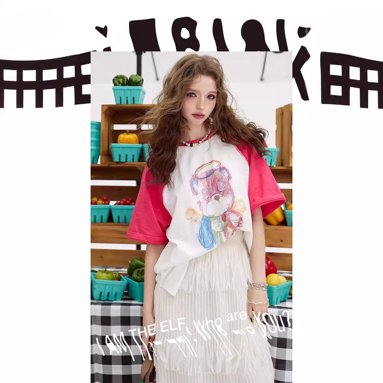 彩虹小熊印花撞色插肩t恤女春夏新款休闲短袖上衣