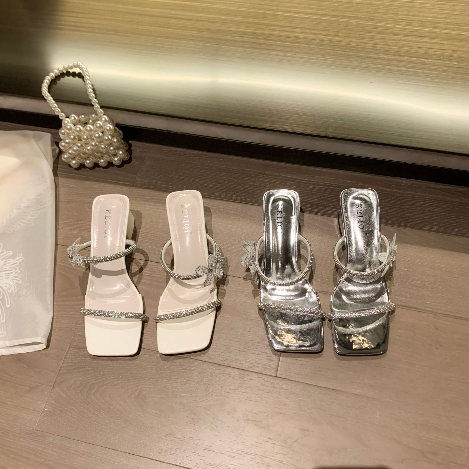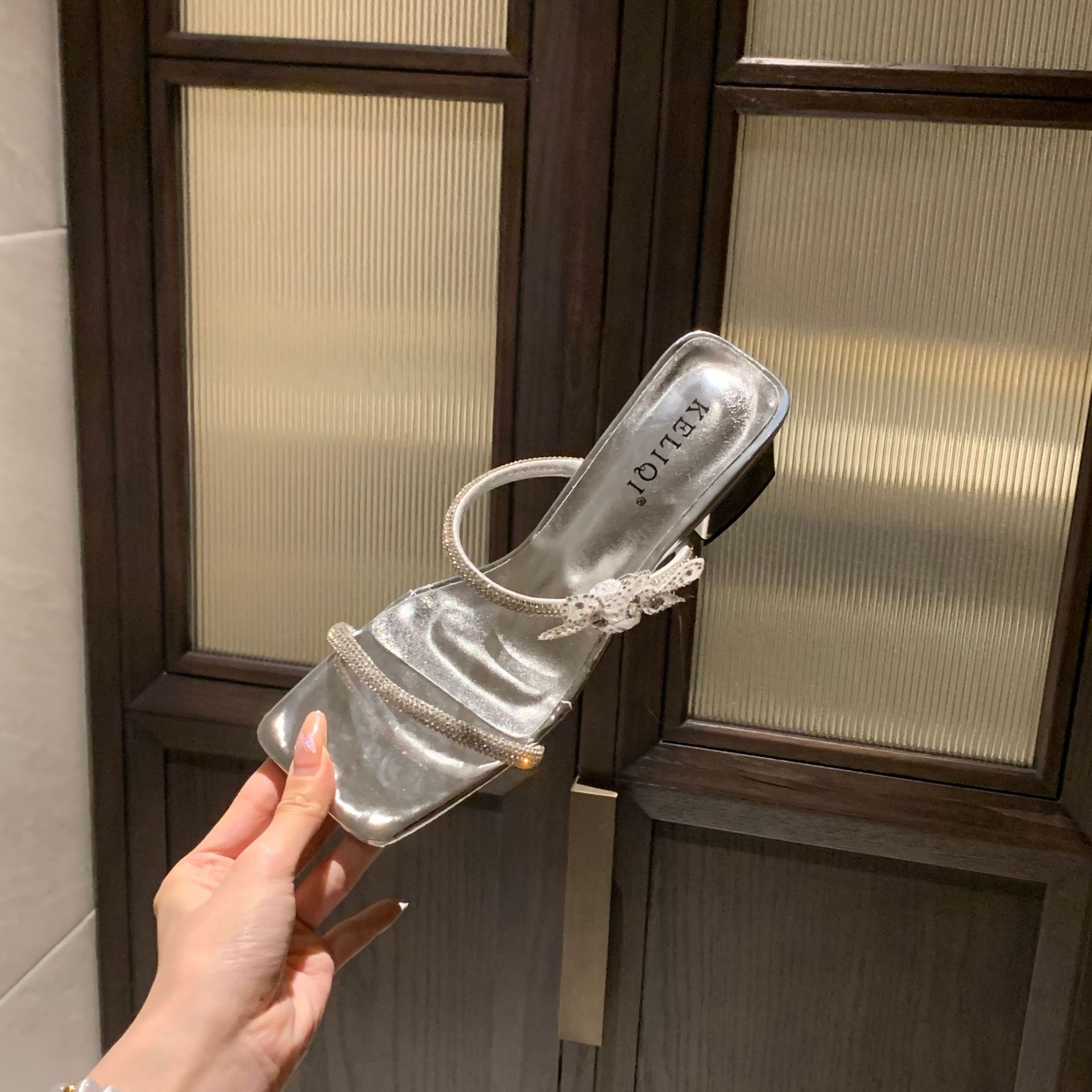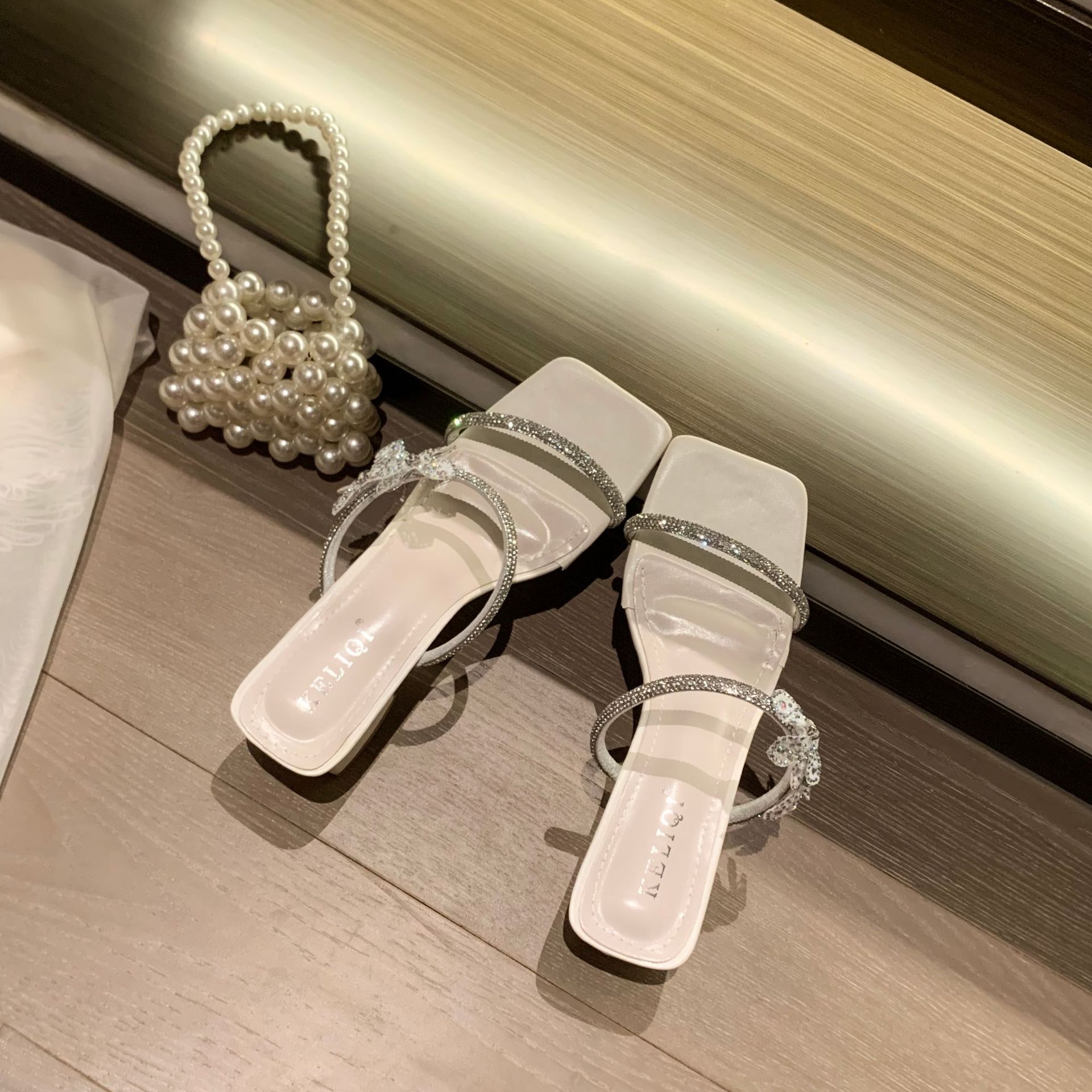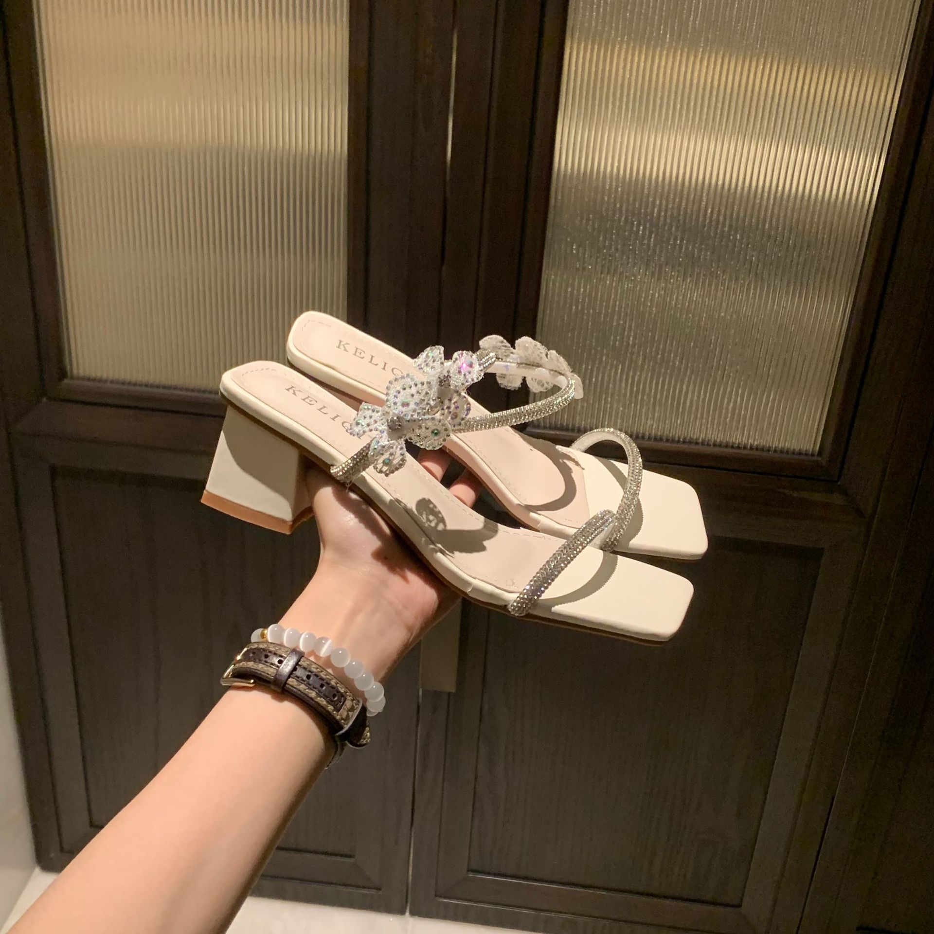 欧美夏新款水钻蝴蝶结一字带粗跟拖鞋女外穿时尚露趾粗跟凉鞋