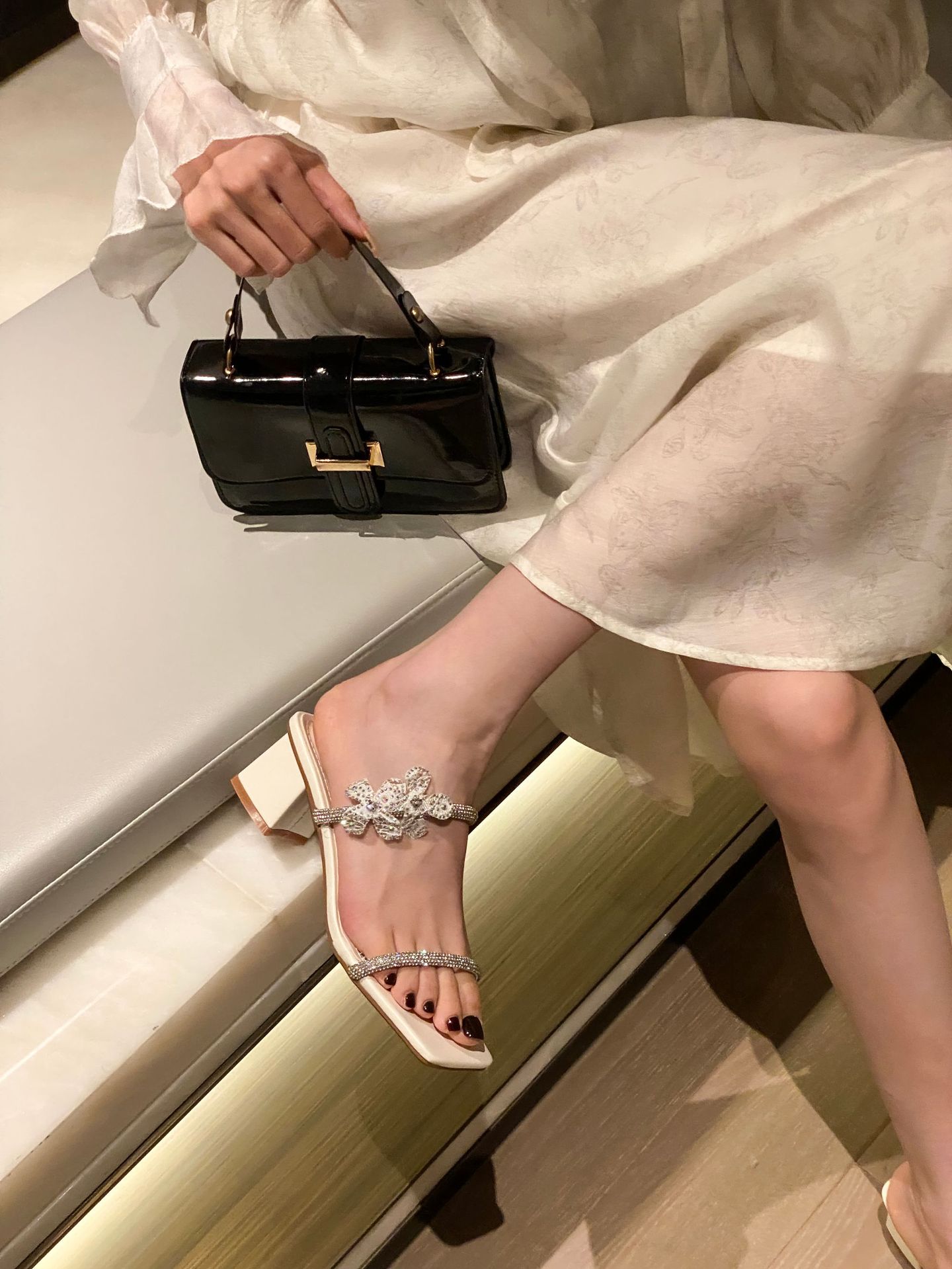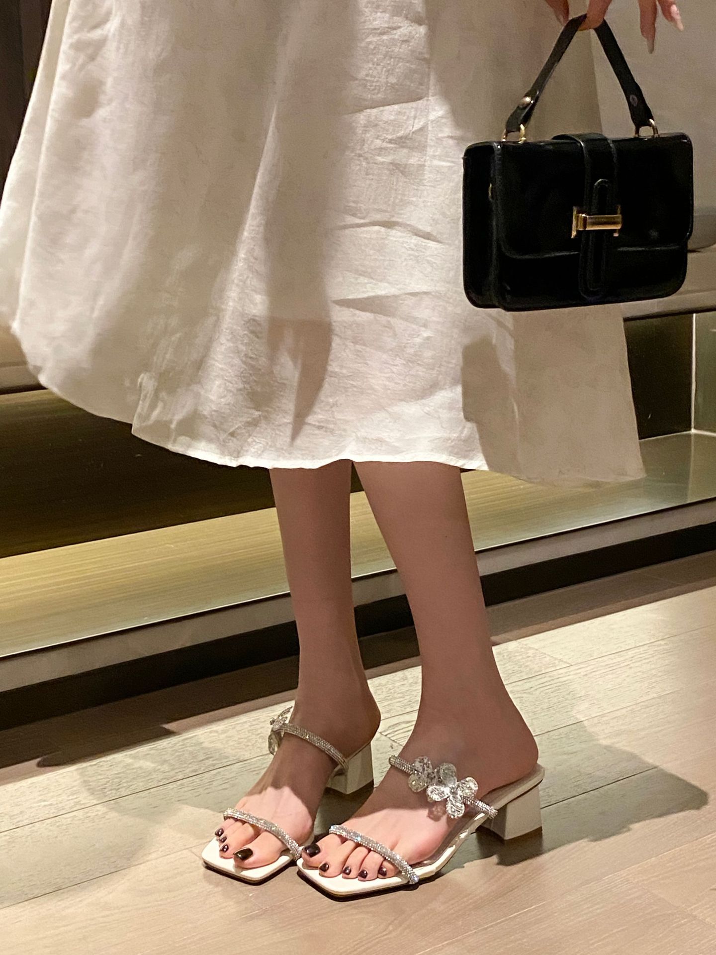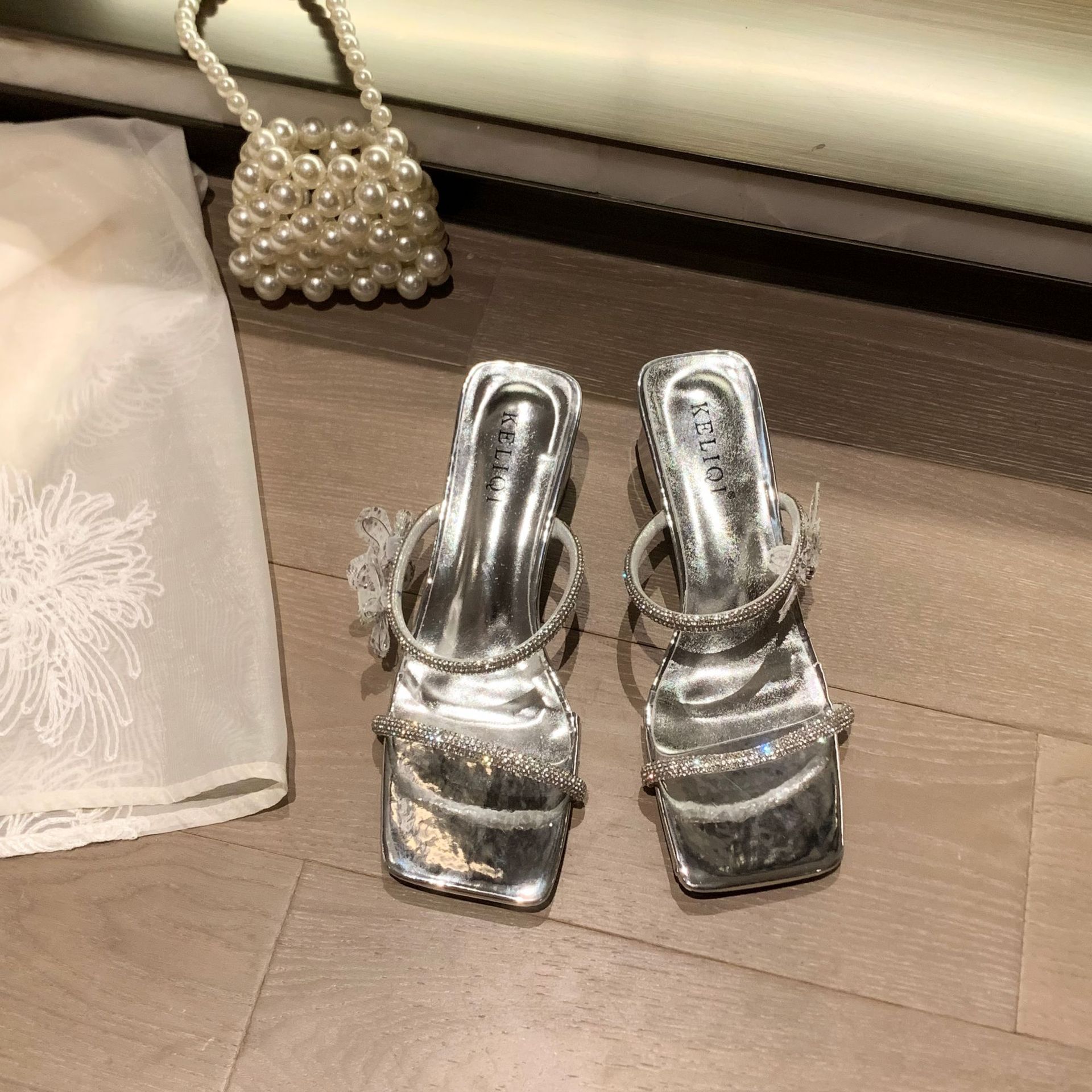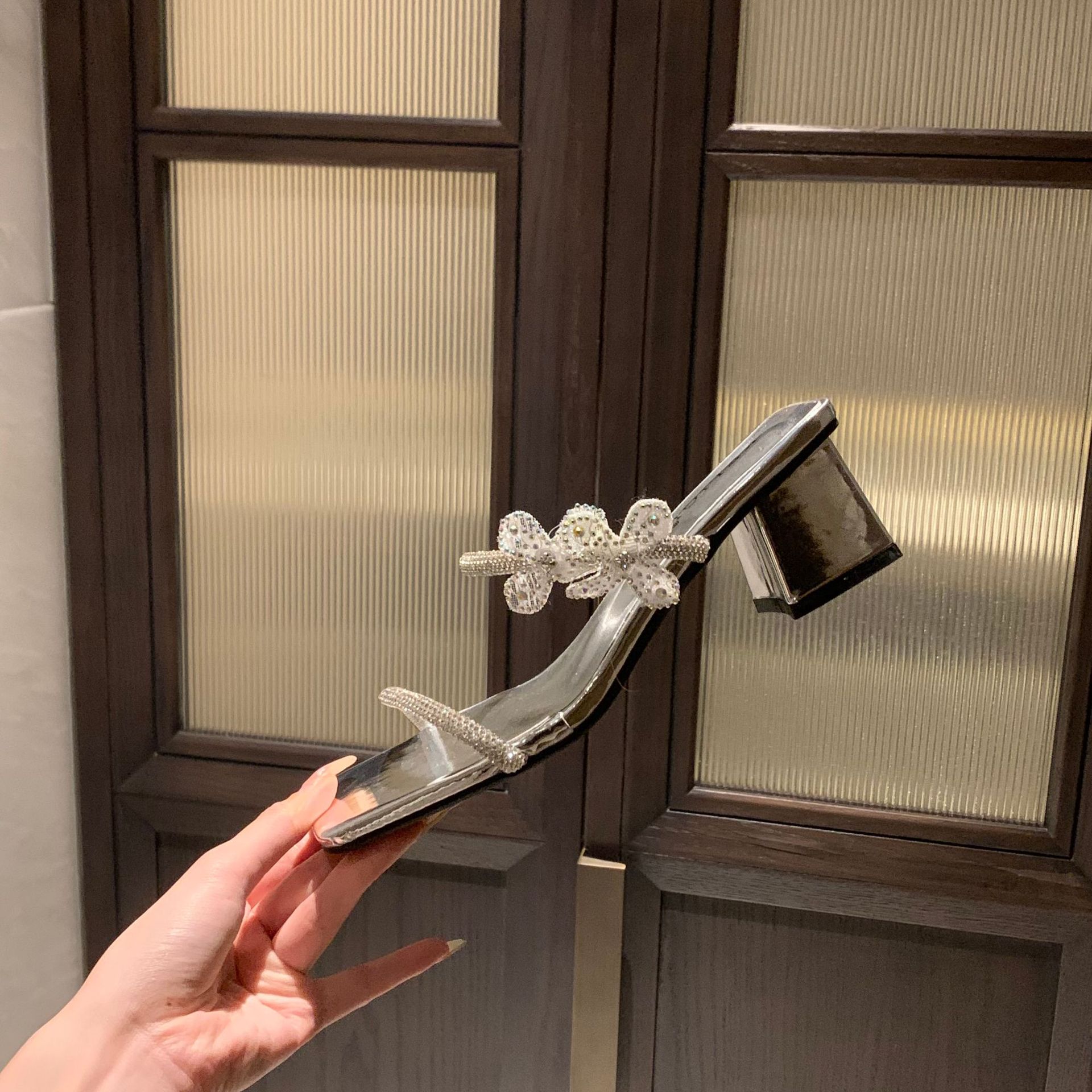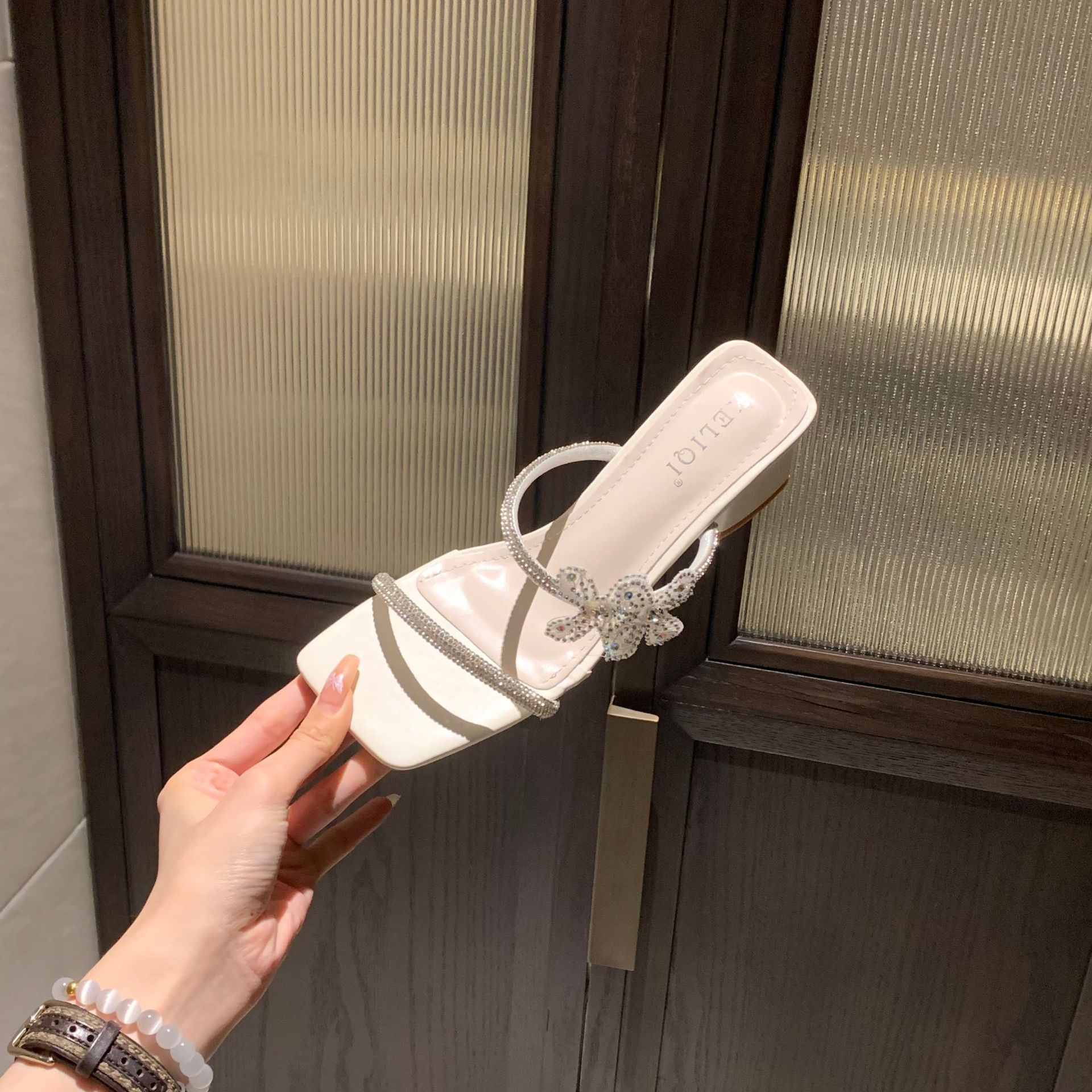 欧美夏新款水钻蝴蝶结一字带粗跟拖鞋女外穿时尚露趾粗跟凉鞋