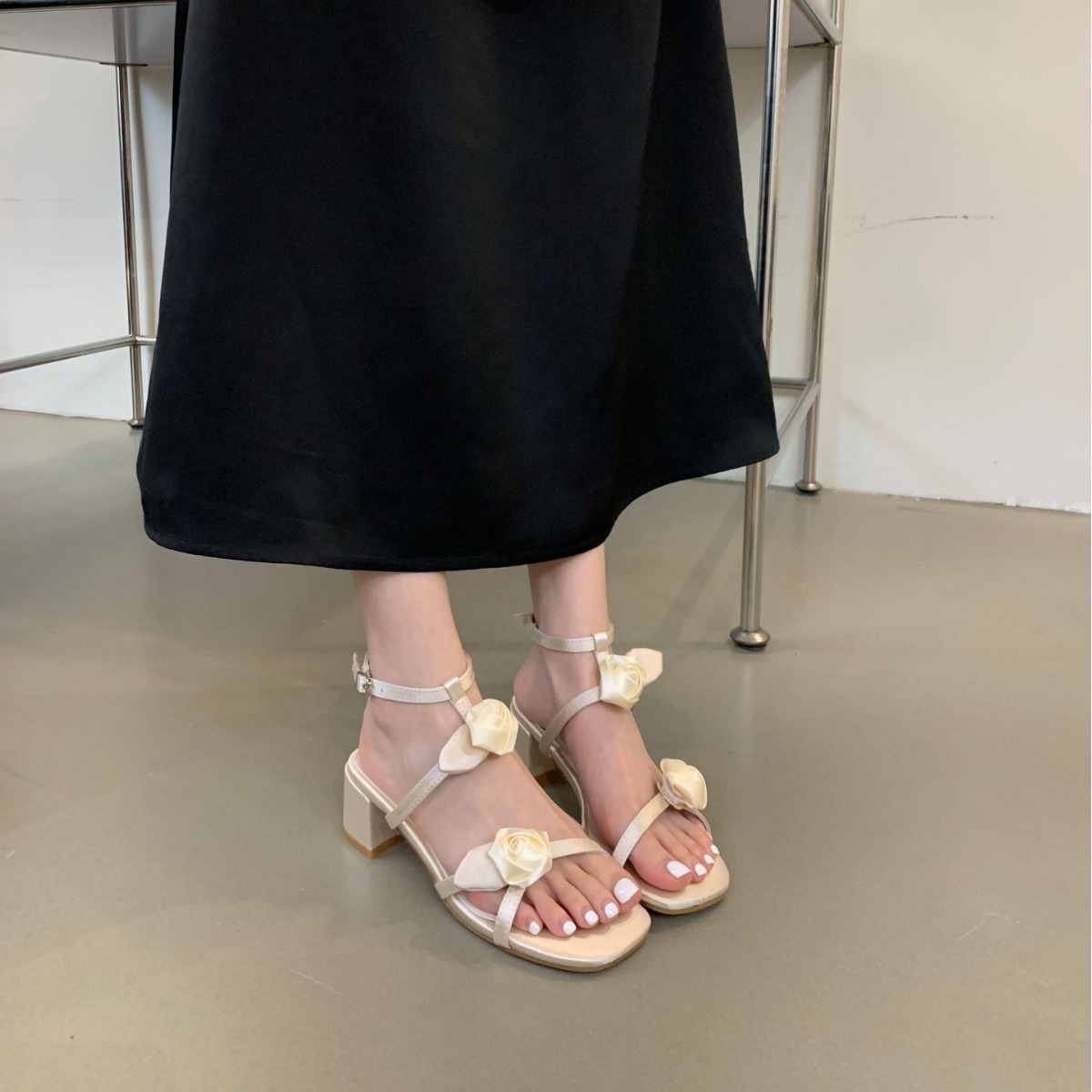 法式气质绸缎花卉名媛一字扣带凉鞋女夏新凉拖甜美配裙子鞋