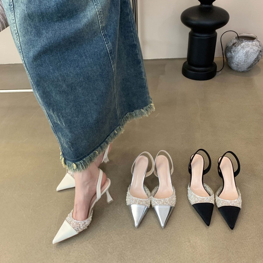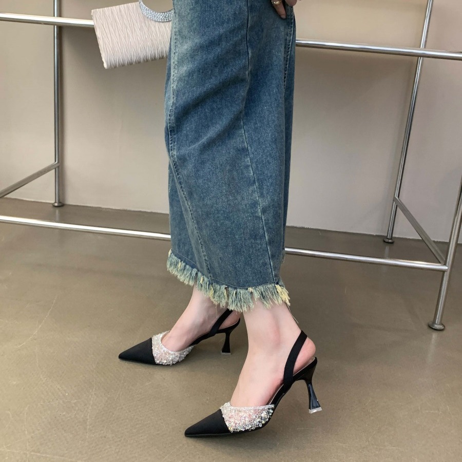 法式气质水钻尖头后空鞋新款透明水钻拼色包头高跟凉鞋女