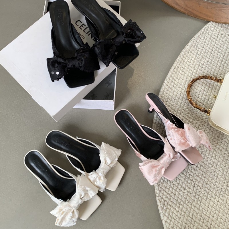 新韩版夏季方头亮片纯色大蝴蝶结细跟休闲中跟简约女凉鞋拖