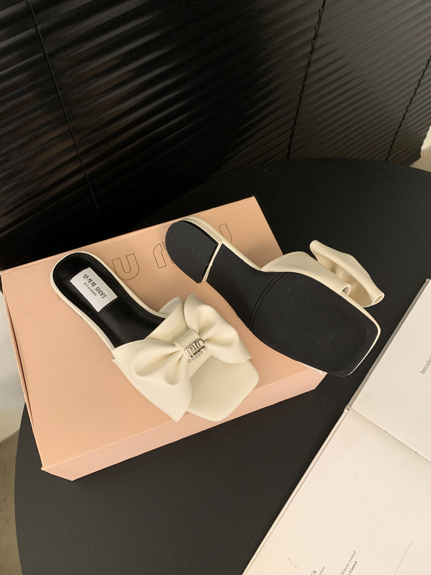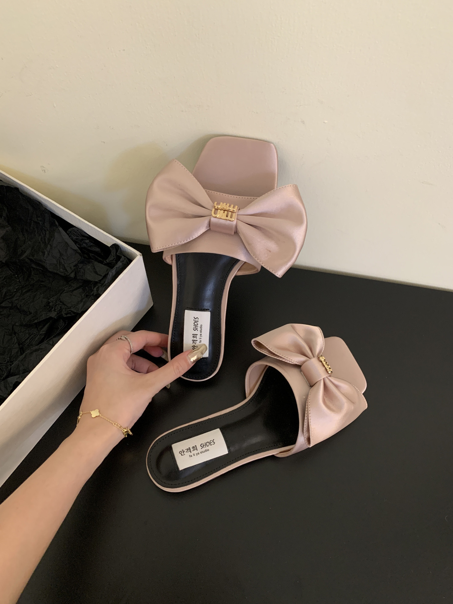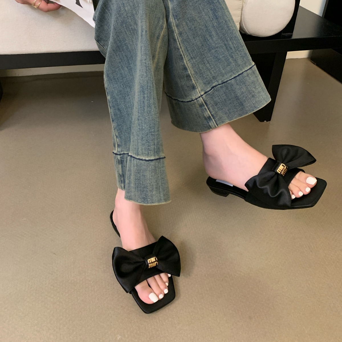 夏季新款方头粗跟一字拖蝴蝶结露趾低跟休闲外穿通勤凉拖鞋子