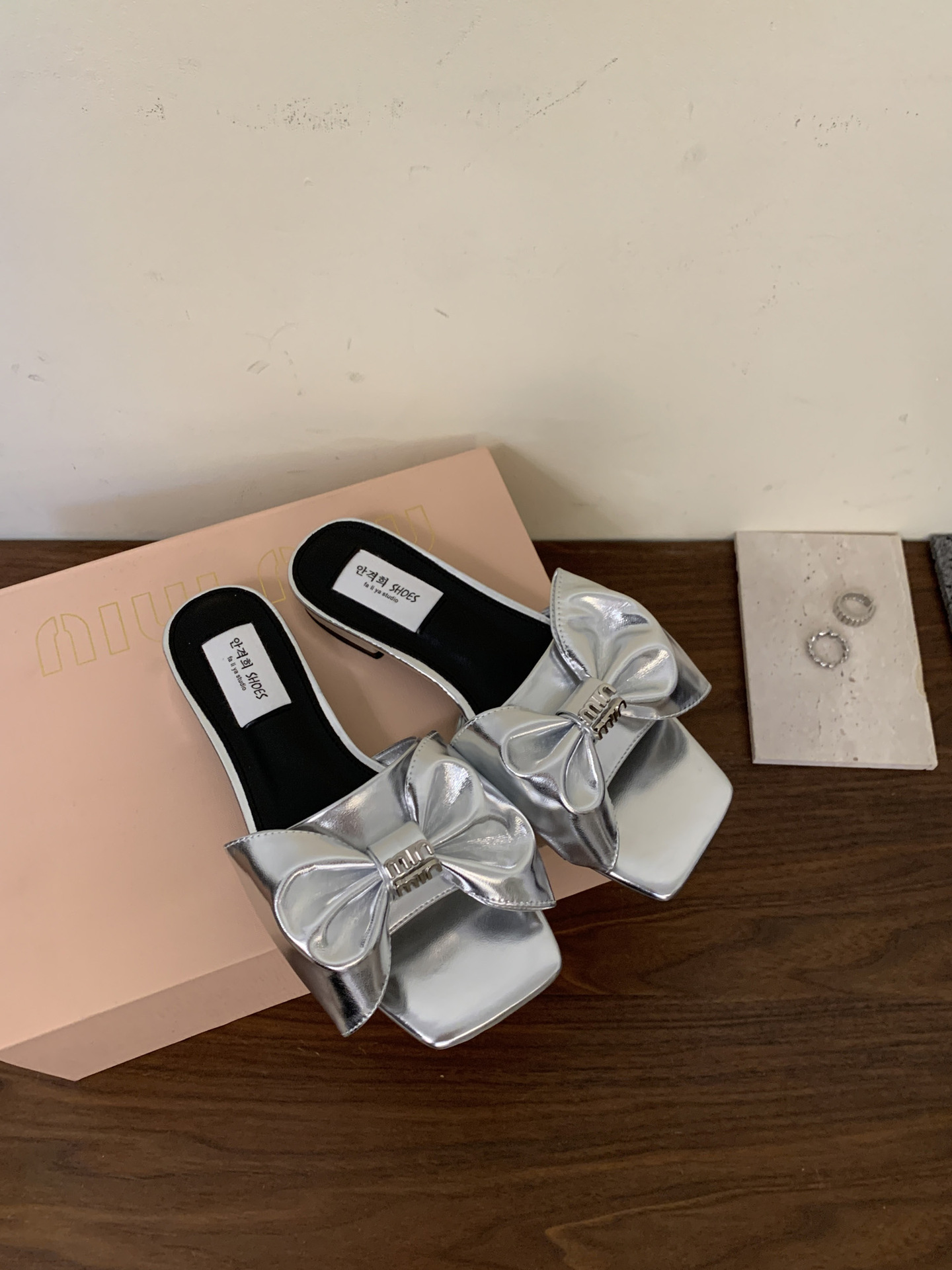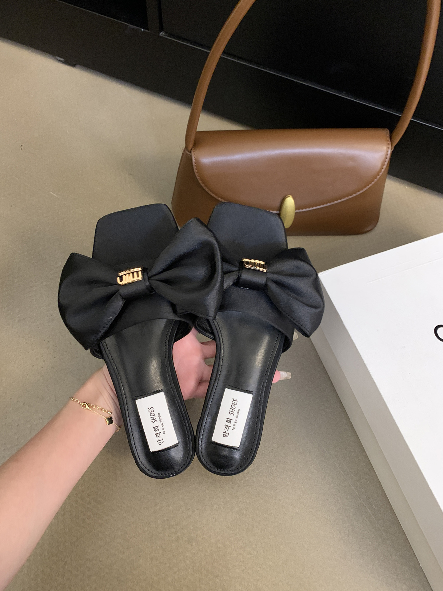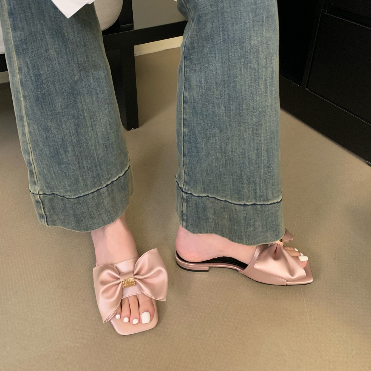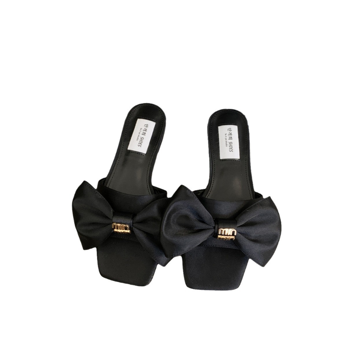 夏季新款方头粗跟一字拖蝴蝶结露趾低跟休闲外穿通勤凉拖鞋子