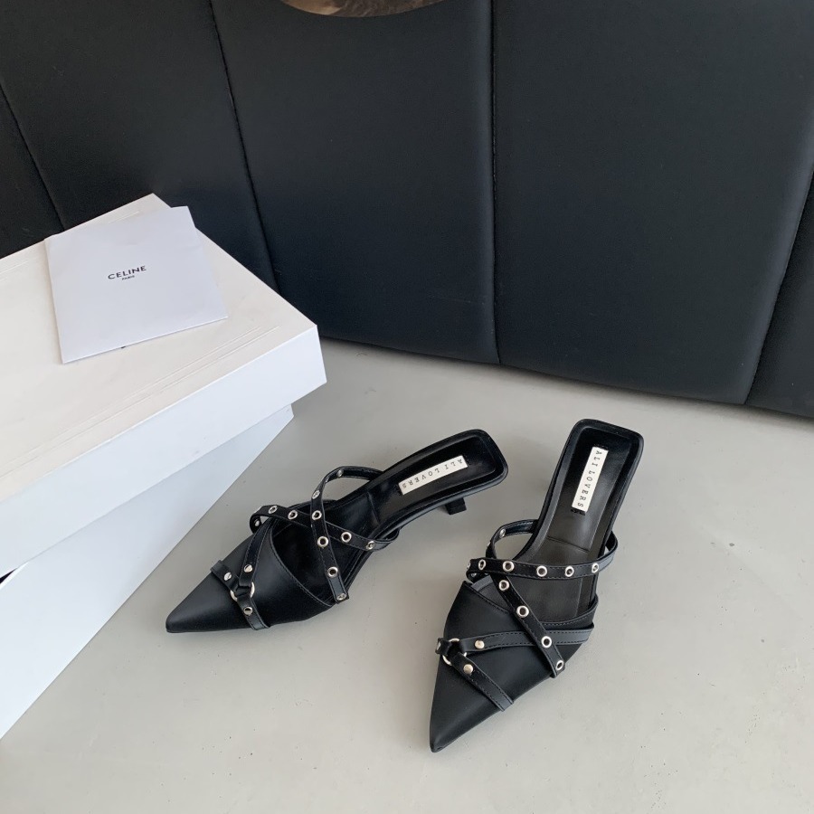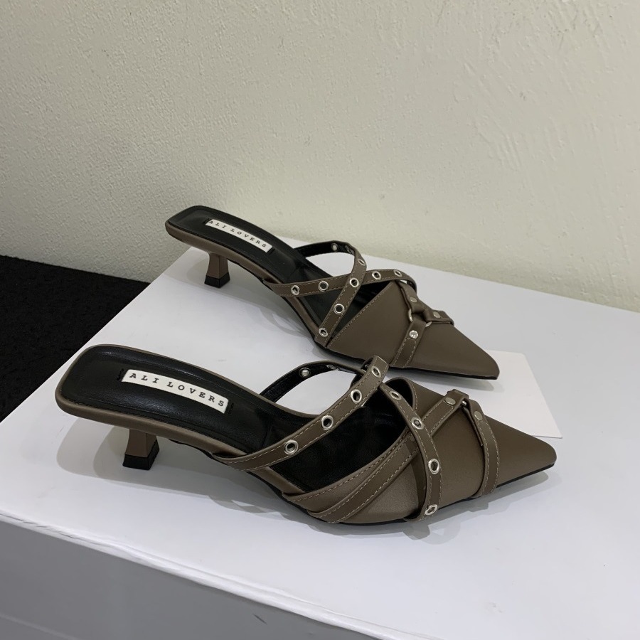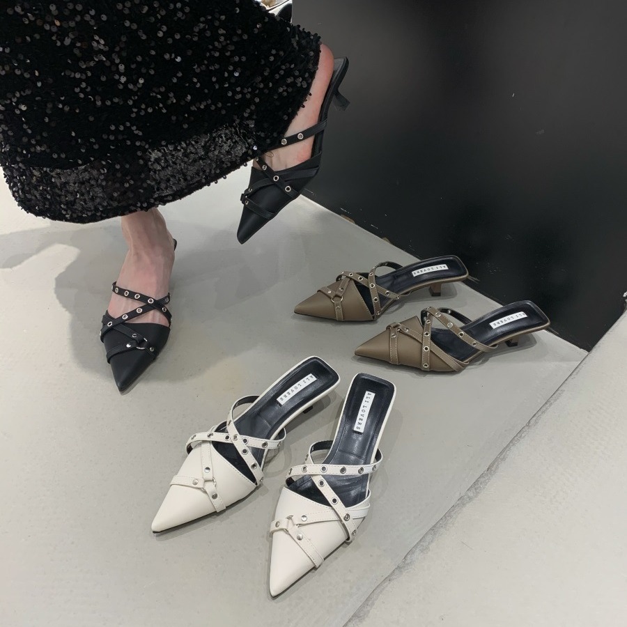 尖头一字带凉鞋女外穿新款时尚铆钉包头一脚蹬粗跟半拖鞋