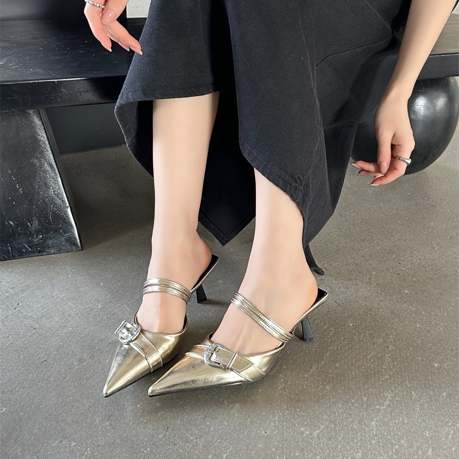 法式皮带扣包头拖鞋女夏新款高跟鞋细跟时尚外穿尖头半拖女鞋