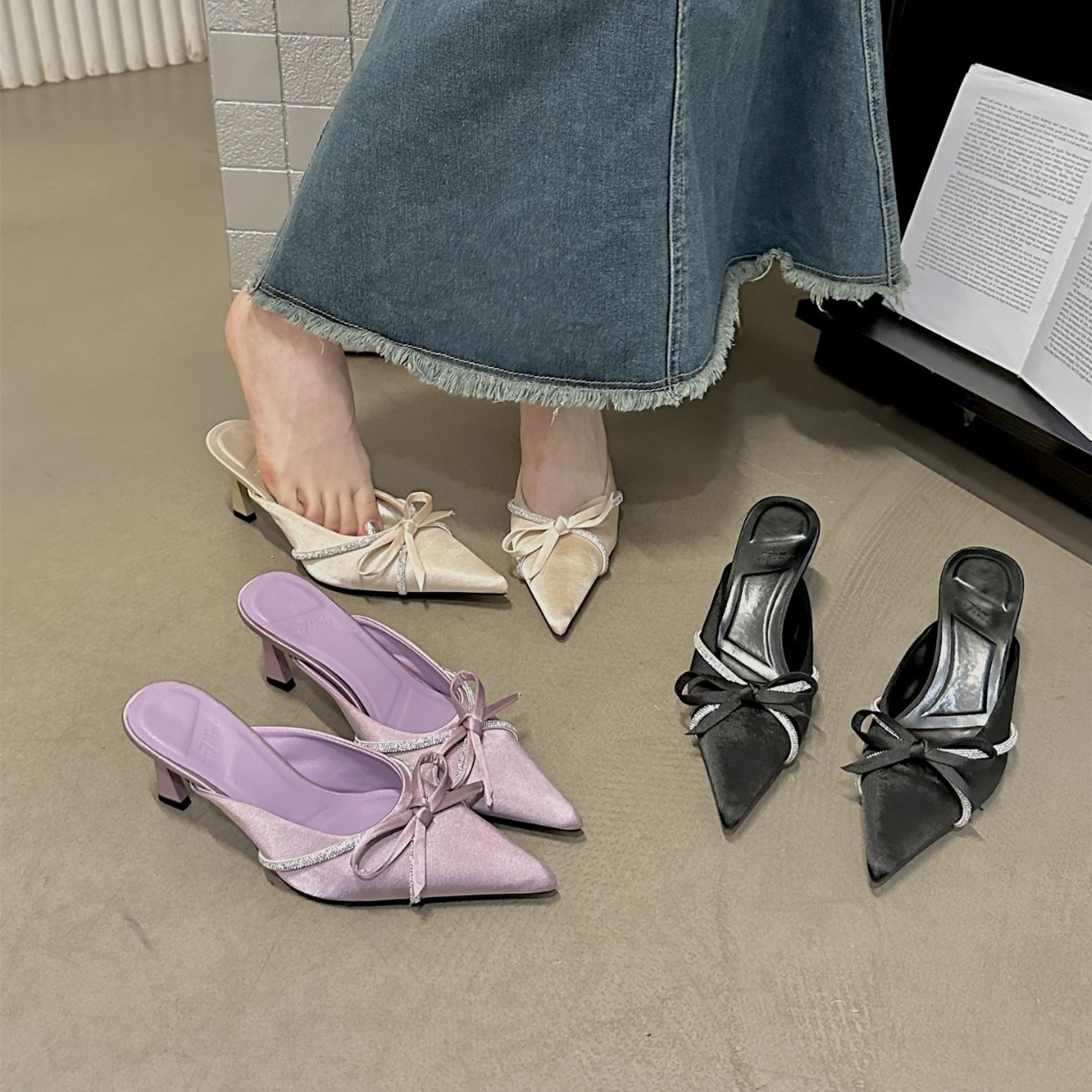 尖头细时尚包头半拖蝴蝶结中跟拖鞋高跟鞋新款女法式凉拖