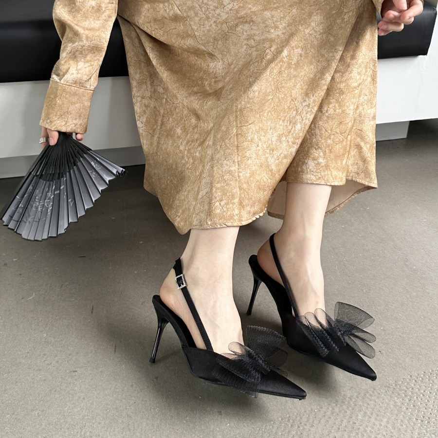 法式气质尖头后空鞋新款绸缎面网纱大蝴蝶结包头高跟凉鞋女