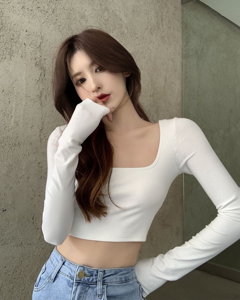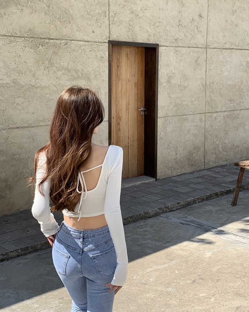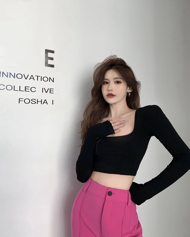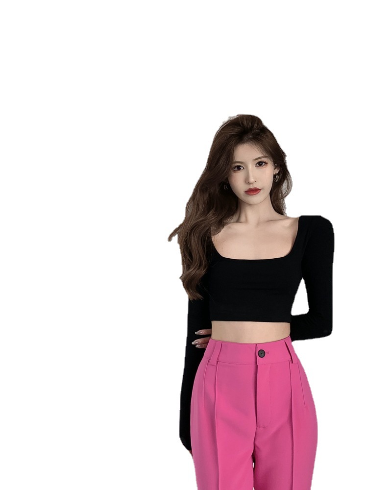 辣妹方领长袖T恤女秋季新款白色绑带短款露背修身打底衫上衣