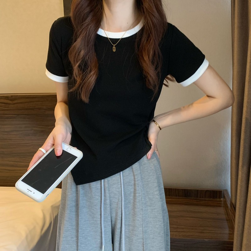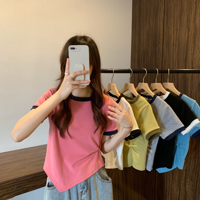 短袖女年新款夏季设计感撞色t恤时尚别致不规则短款学生上衣