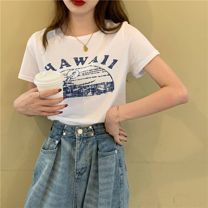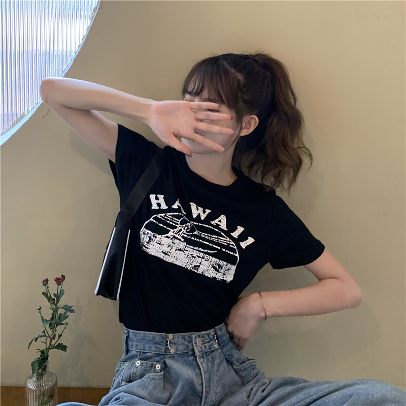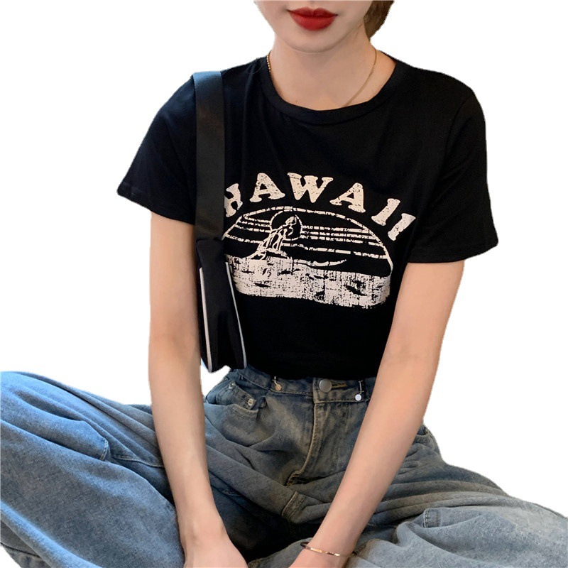 美式复古黑色短袖T恤女装夏季新款设计感辣妹短款学生上衣服
