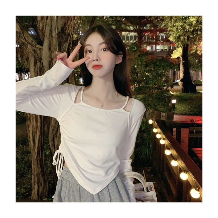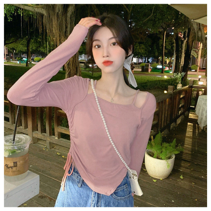 【月销10万】2025纯欲露肩T恤设计感辣妹背心不规则飘带打底上衣