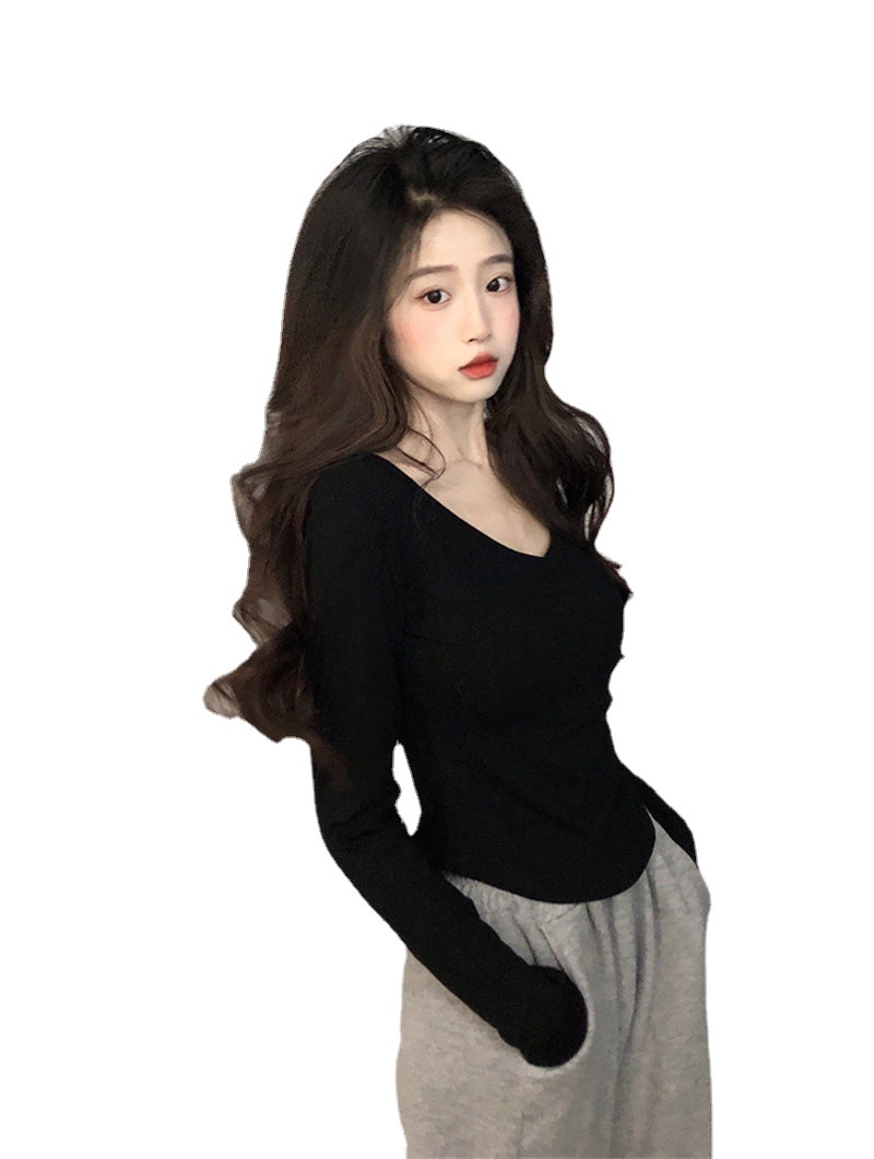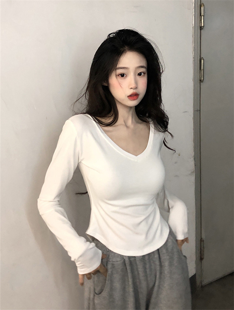 纯欲风V领修身长袖T恤女秋季新款显瘦辣妹别致学生上衣女装潮