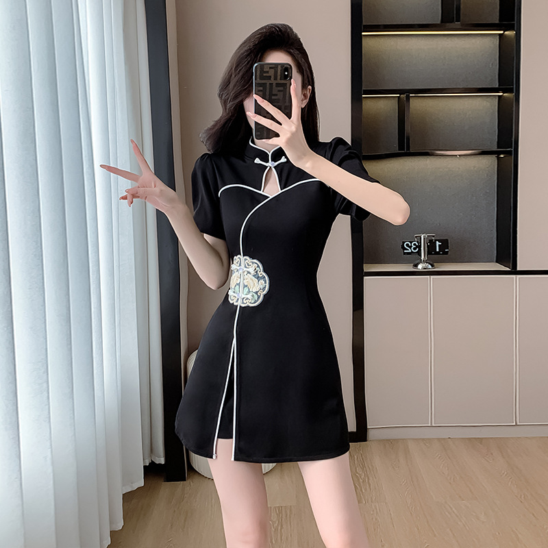 黑色旗袍年轻款高端气质连衣裙新款复古国风新中式两件套套装