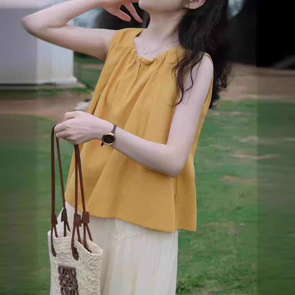 芒果味的夏天 黄色褶皱领口天丝质感娃娃背心无袖上衣