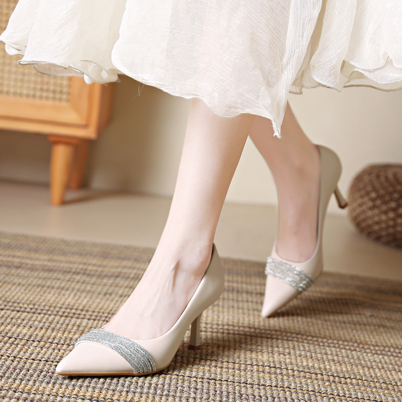 气质女鞋新款时尚尖头高跟鞋 轻奢超纤水钻细跟日常单鞋