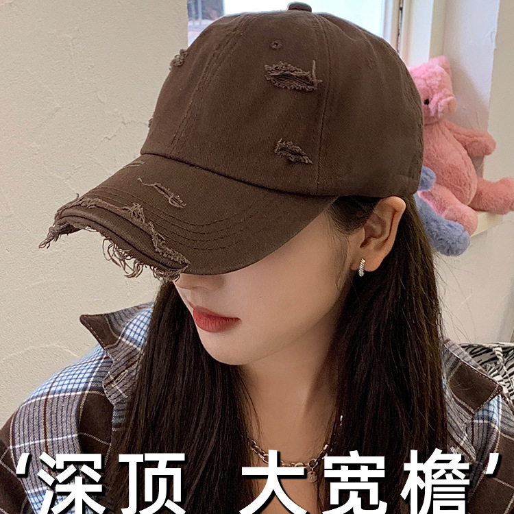 咖色棒球帽女深顶大头围春夏宽帽檐显脸小破洞软顶鸭舌帽新款