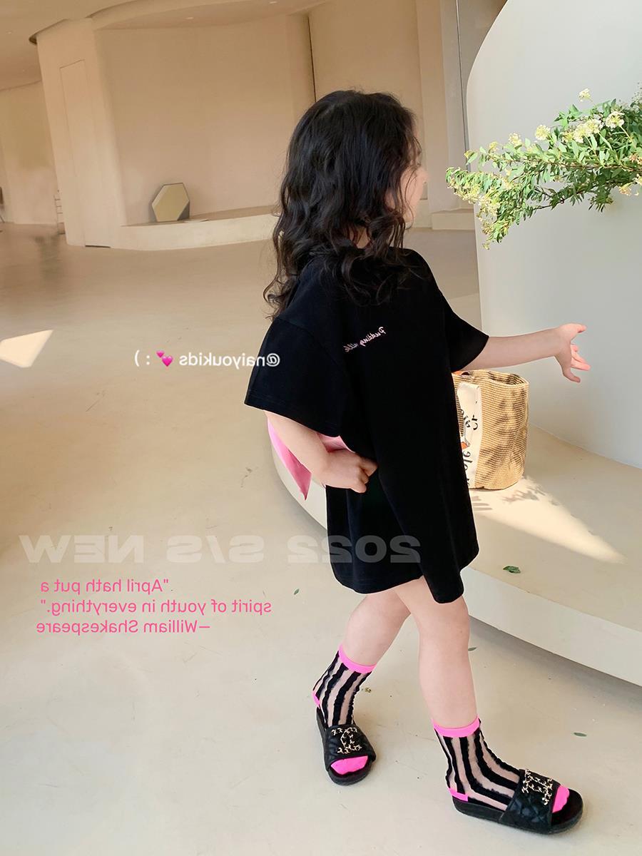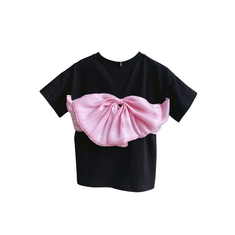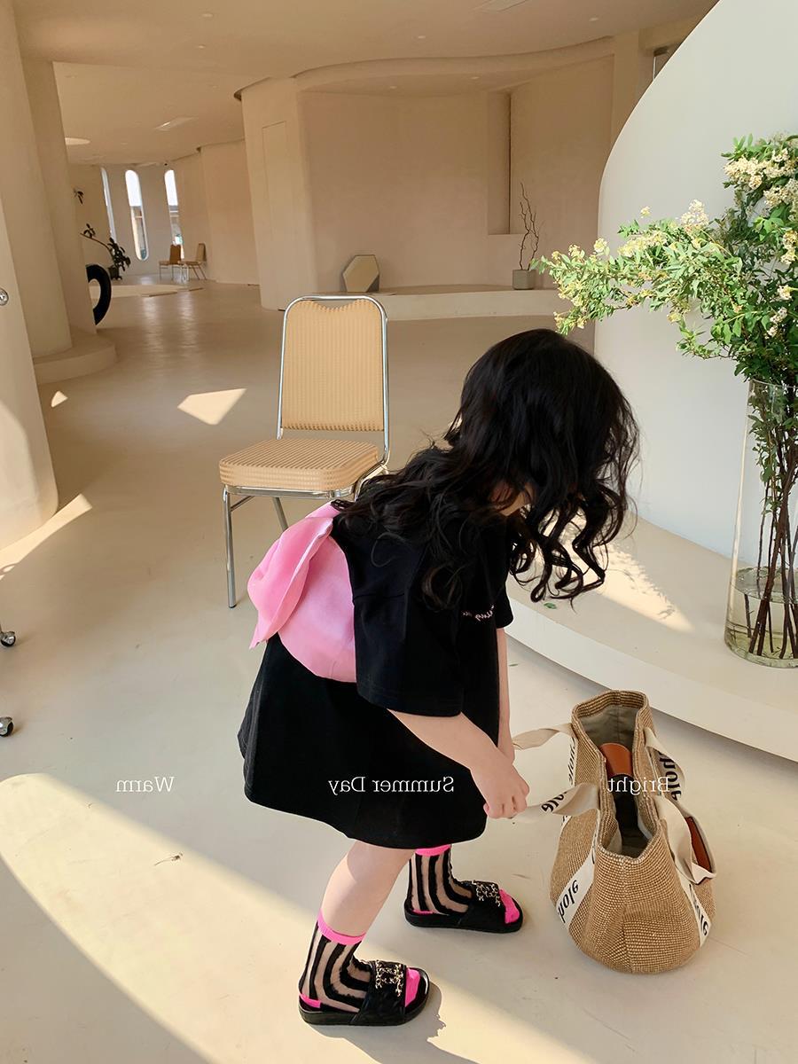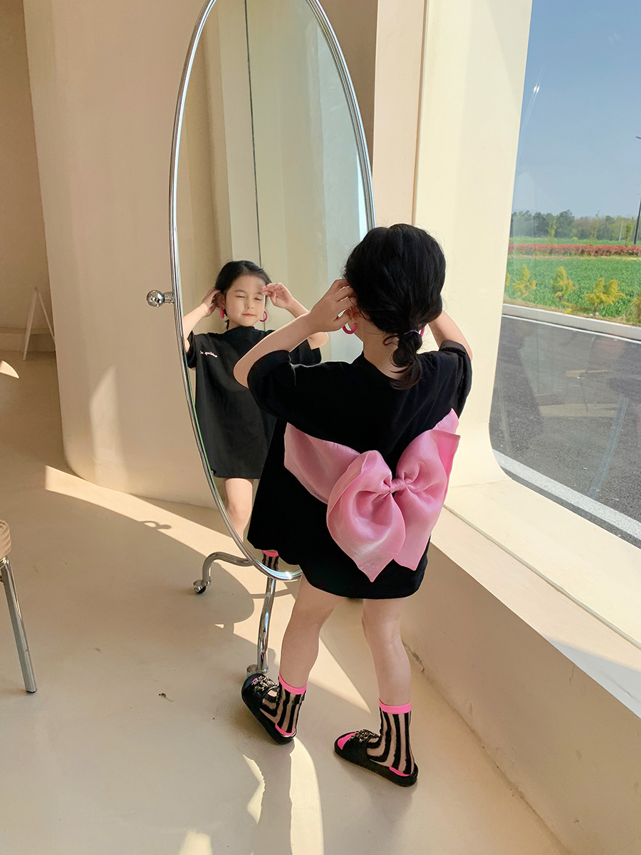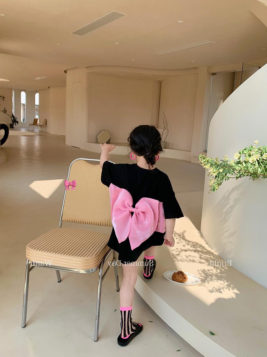 女童短袖黑色T恤连衣裙2025新款夏季设计感蝴蝶结宝宝洋气裙子潮