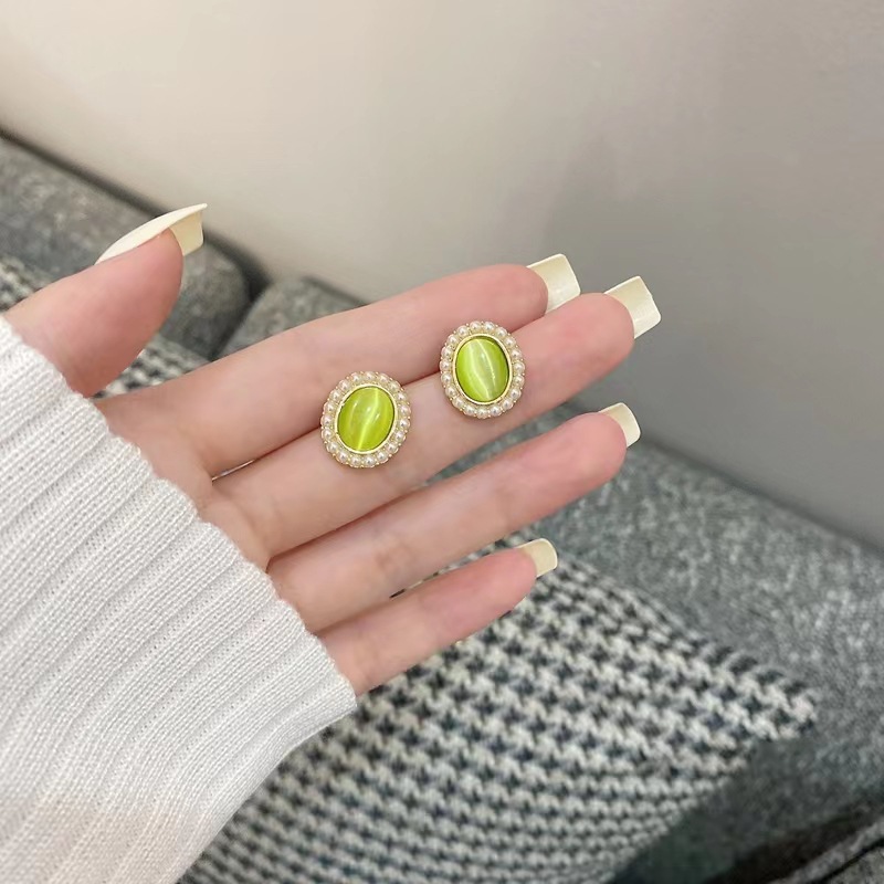 S925复古赫本风温柔优雅港风百搭珍珠巴洛克绿猫眼石耳钉耳环耳夹