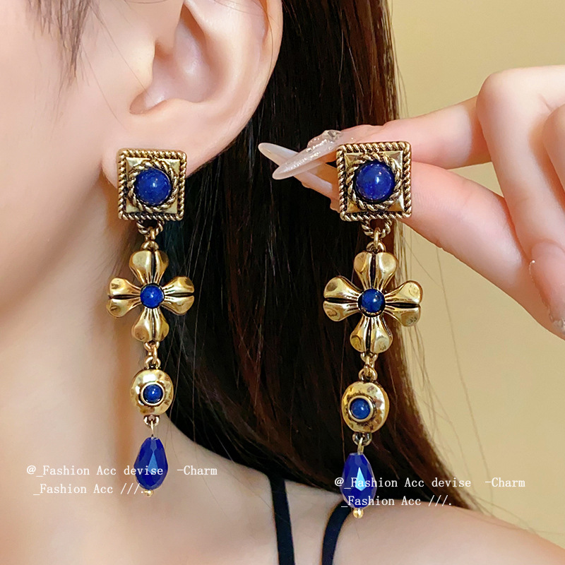 中古vintage耳环银针方形花朵水滴长款耳坠宫廷风复古气质耳饰女