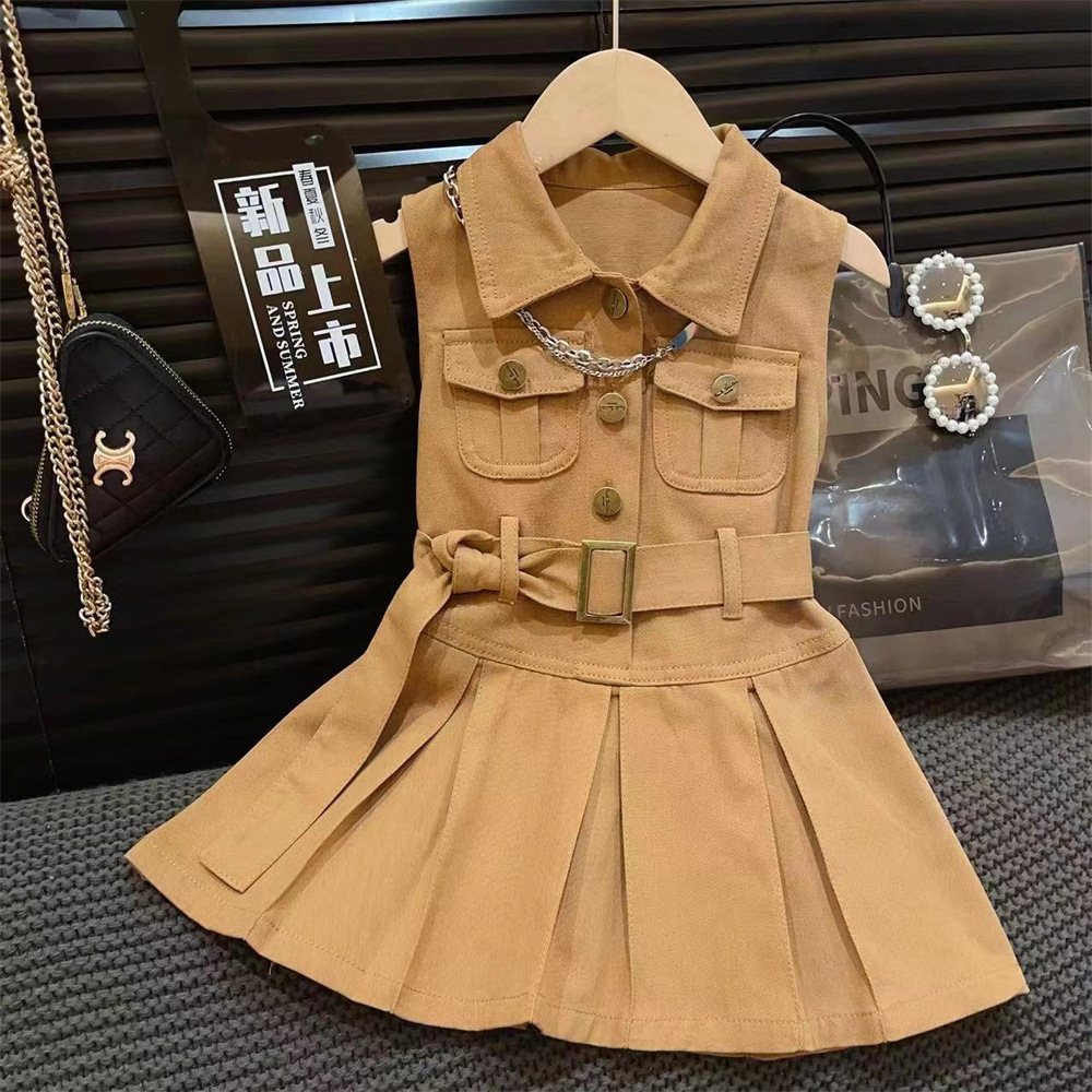 新品儿童宝宝A字裙夏装时尚翻领腰带无袖衬衫式修身牛仔连衣裙