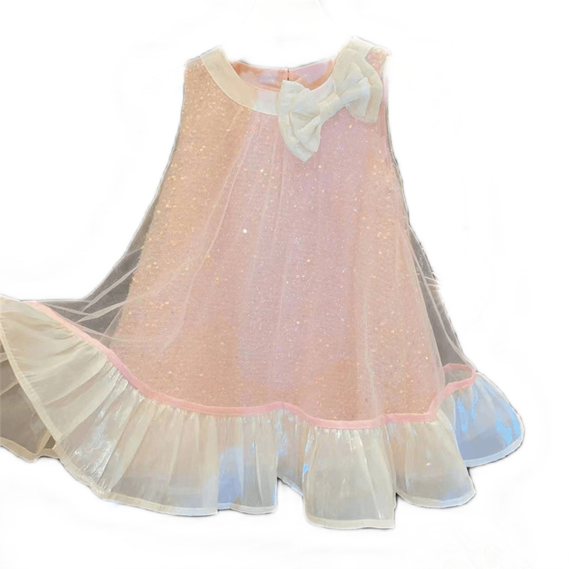 夏季新款韩版女童无袖蝴蝶结网纱背心连衣裙宝宝气质亮片公主裙子