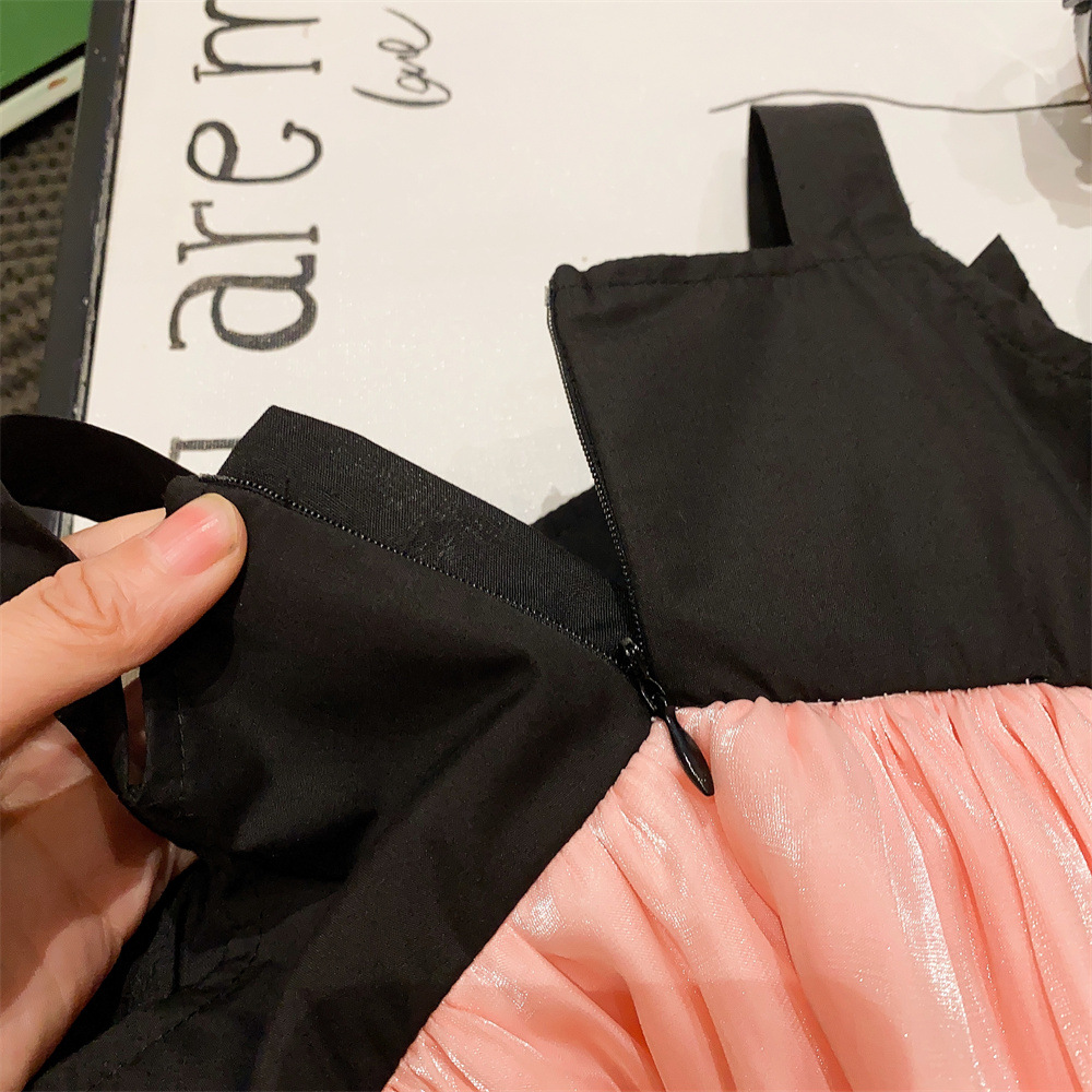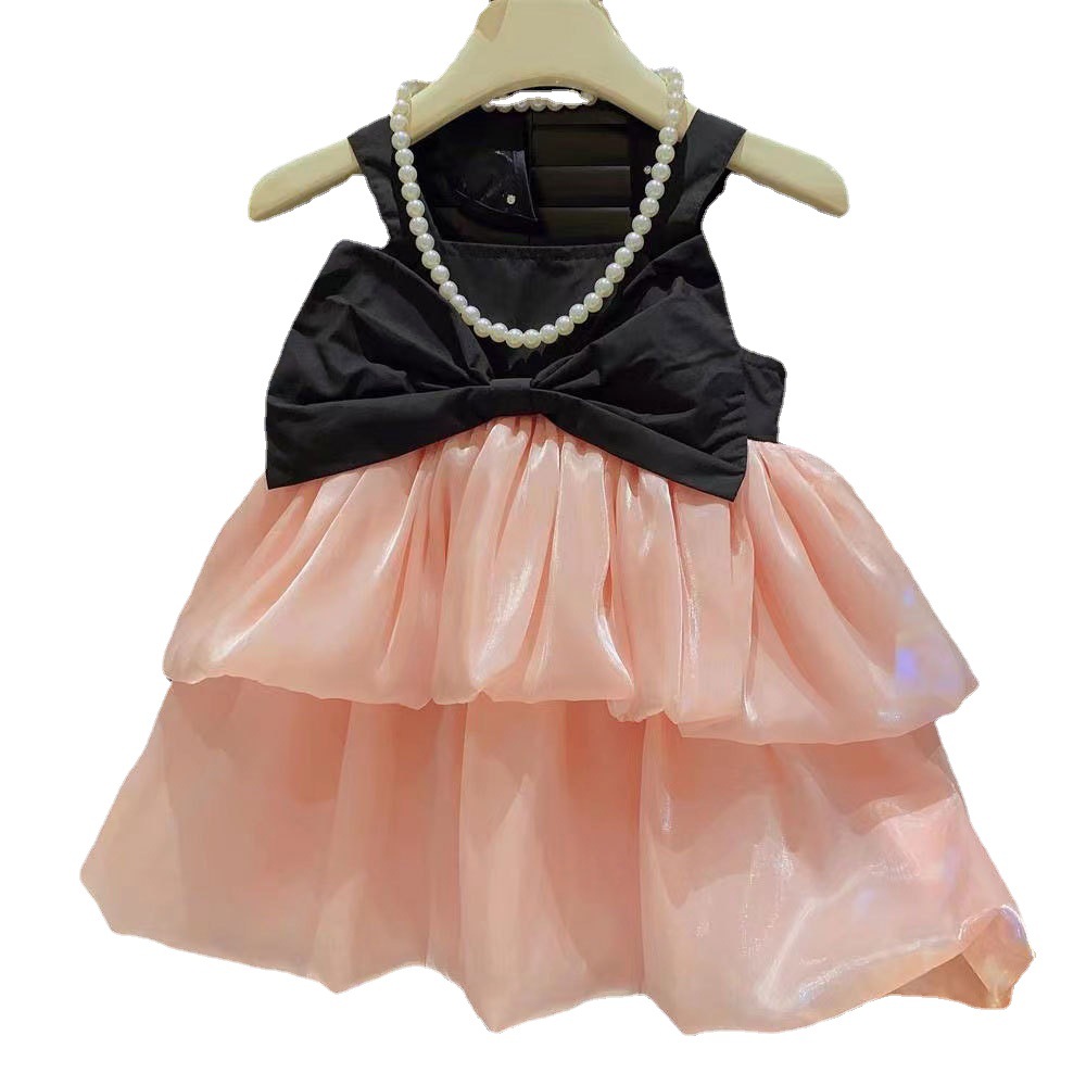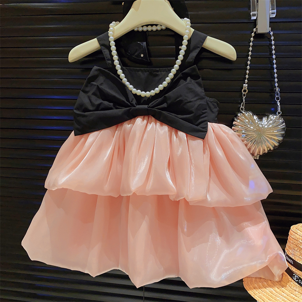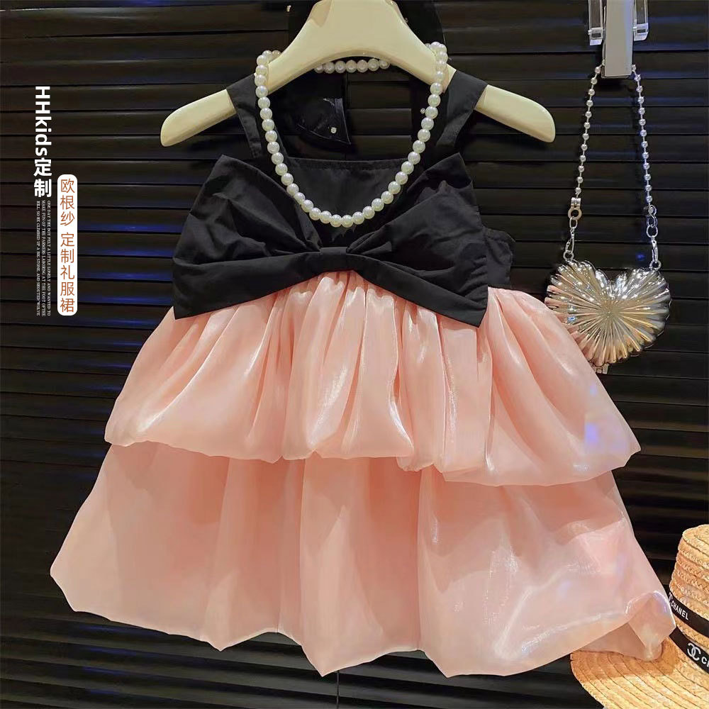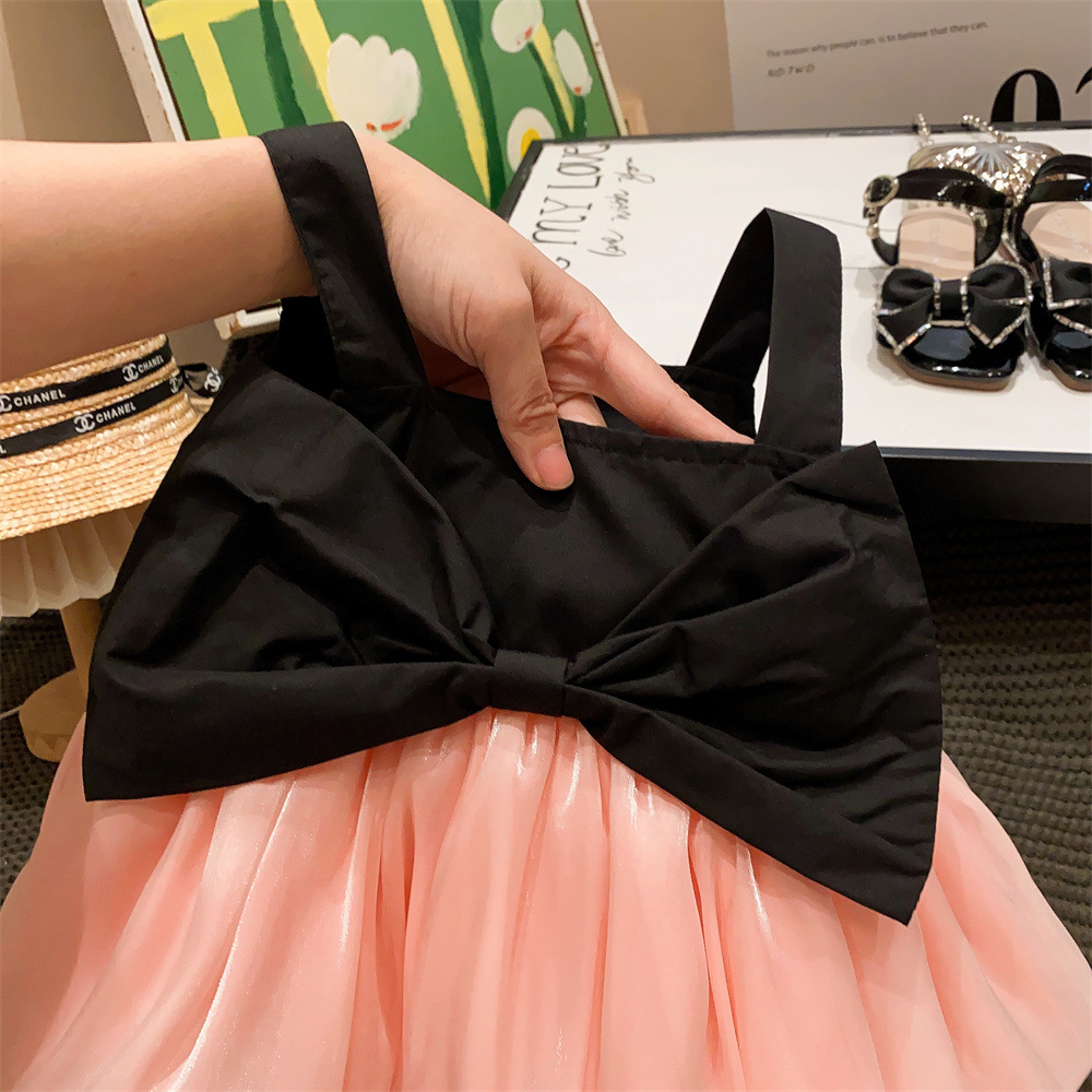 新品女童大蝴蝶结吊带拼接洋气珠光纱气质公主裙2025夏装中小童裙