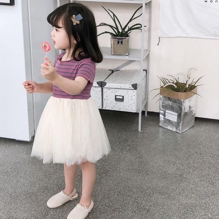 女童针织条纹短袖连衣裙2025夏装新款宝宝可爱网纱拼接公主裙子潮